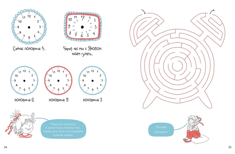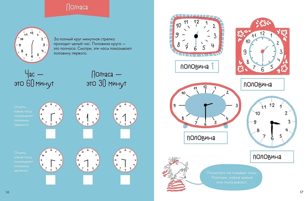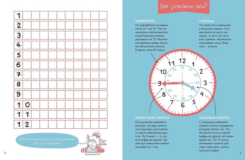 Учим время. Час, полчаса, четверть часа. Знакомимся с часами и учимся определять время. Развивающие тетради вместе с Конни!