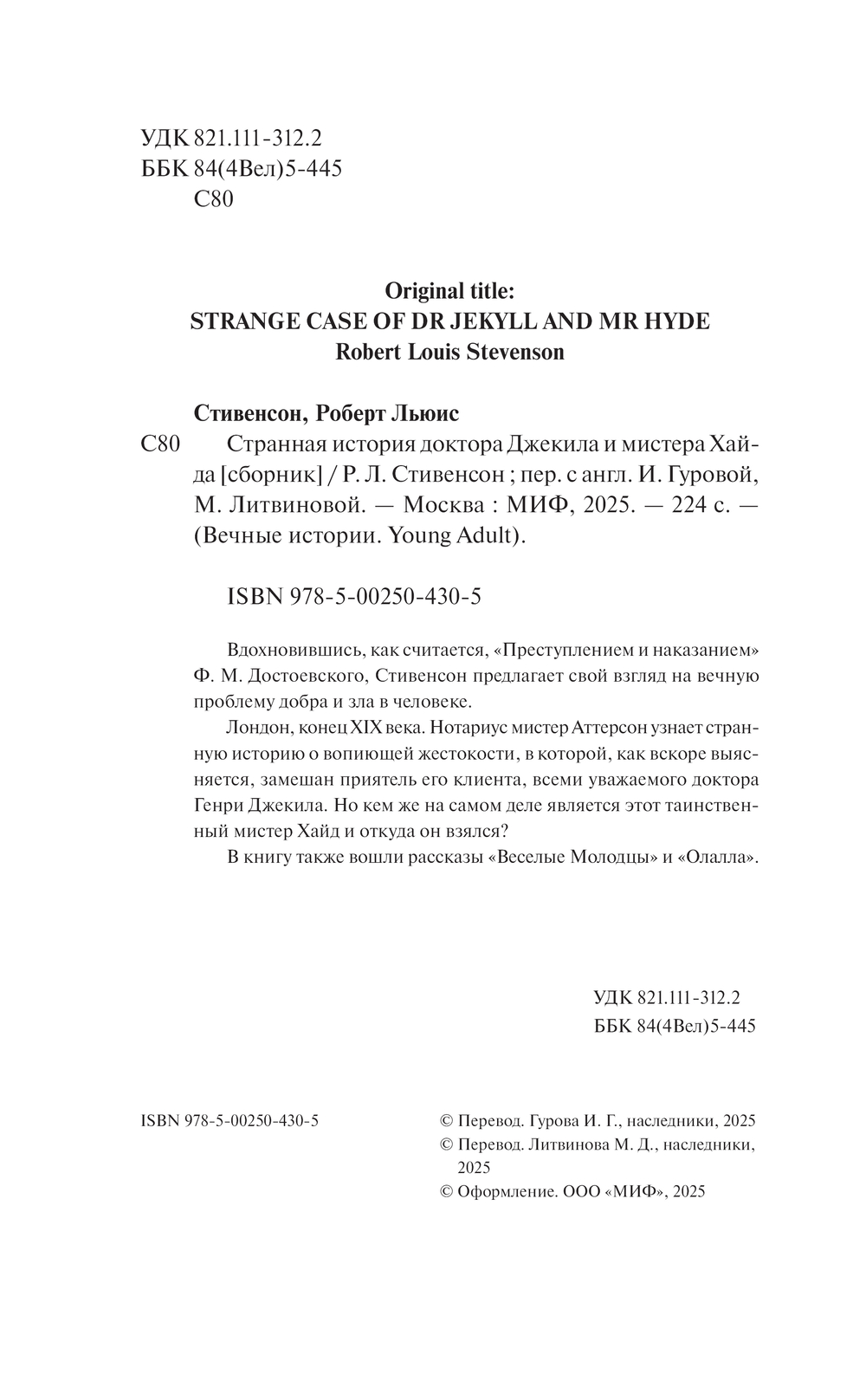 Знаменитая готическая повесть Роберта Льюиса Стивенсона о двойственной человеческой природе – в стильном Young Adult оформлении. В книгу также вошли рассказы "Веселые Молодцы" и "Олалла".