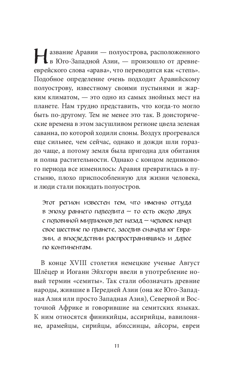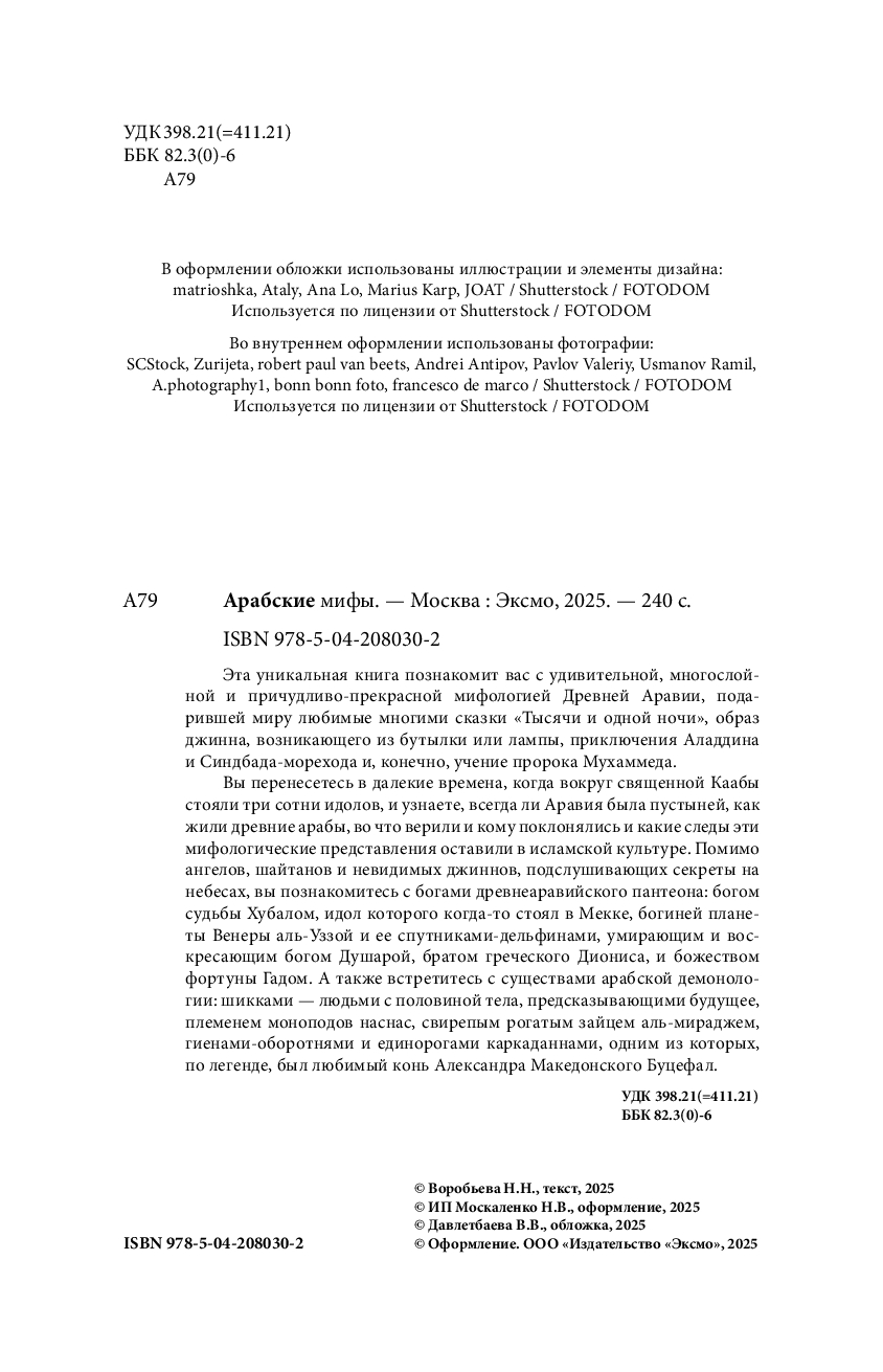 Вы перенесетесь в далекие времена, когда вокруг священной Каабы стояли три сотни идолов и узнаете, всегда ли Аравия была пустыней, как жили древние арабы, во что верили и кому поклонялись и какие следы эти мифологические представления оставили в исламской культуре. Помимо ангелов, шайтанов и невидимых джиннов, подслушивающих секреты на небесах, вы познакомитесь с богами древнеаравийского пантеона: богом судьбы Хубалом, идол которого когда-то стоял в Мекке, богиней планеты Венеры аль-Уззой и ее спутниками-дельфинами, умирающим и воскресающим богом Душарой, братом греческого Диониса, и божеством фортуны Гадом. А также встретитесь с существами арабской демонологии: шикками – людьми с половиной тела, предсказывающими будущее, племенем моноподов наснас, свирепым рогатым зайцем аль-мираджем, гиенами-оборотнями и единорогами каркаданнами, одним из которых, по легенде, был любимый конь Александра Македонского Буцефал.
