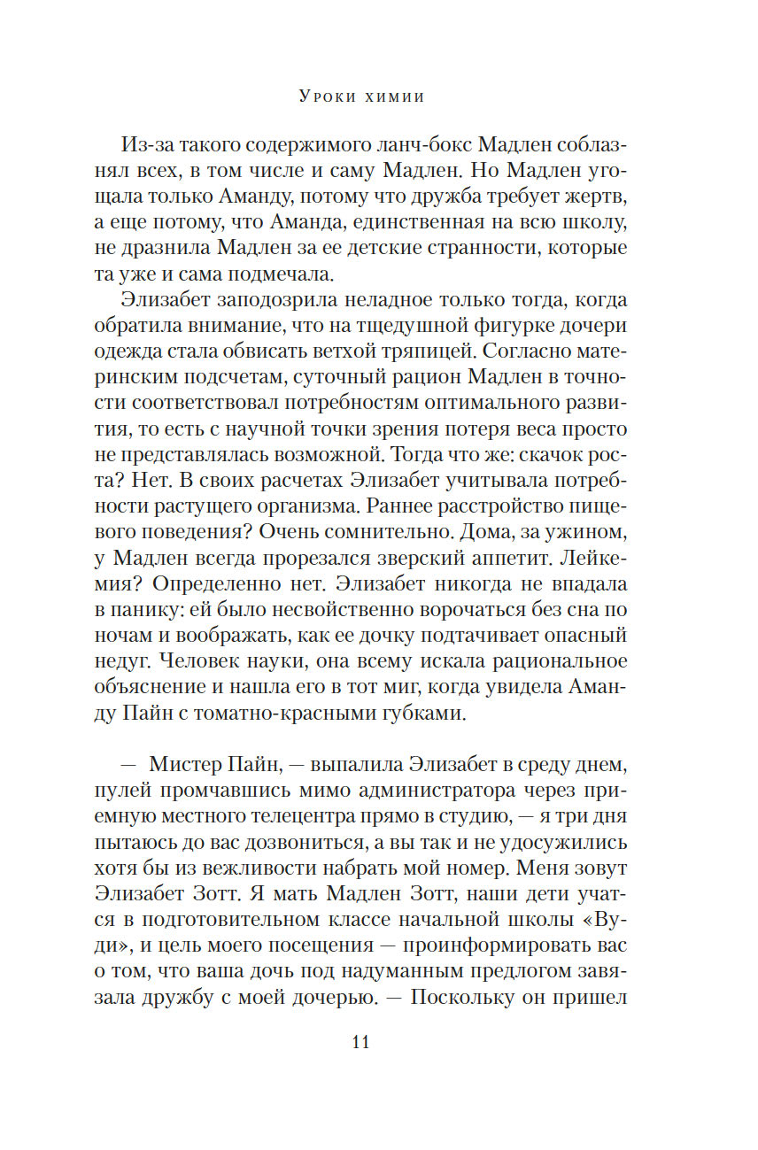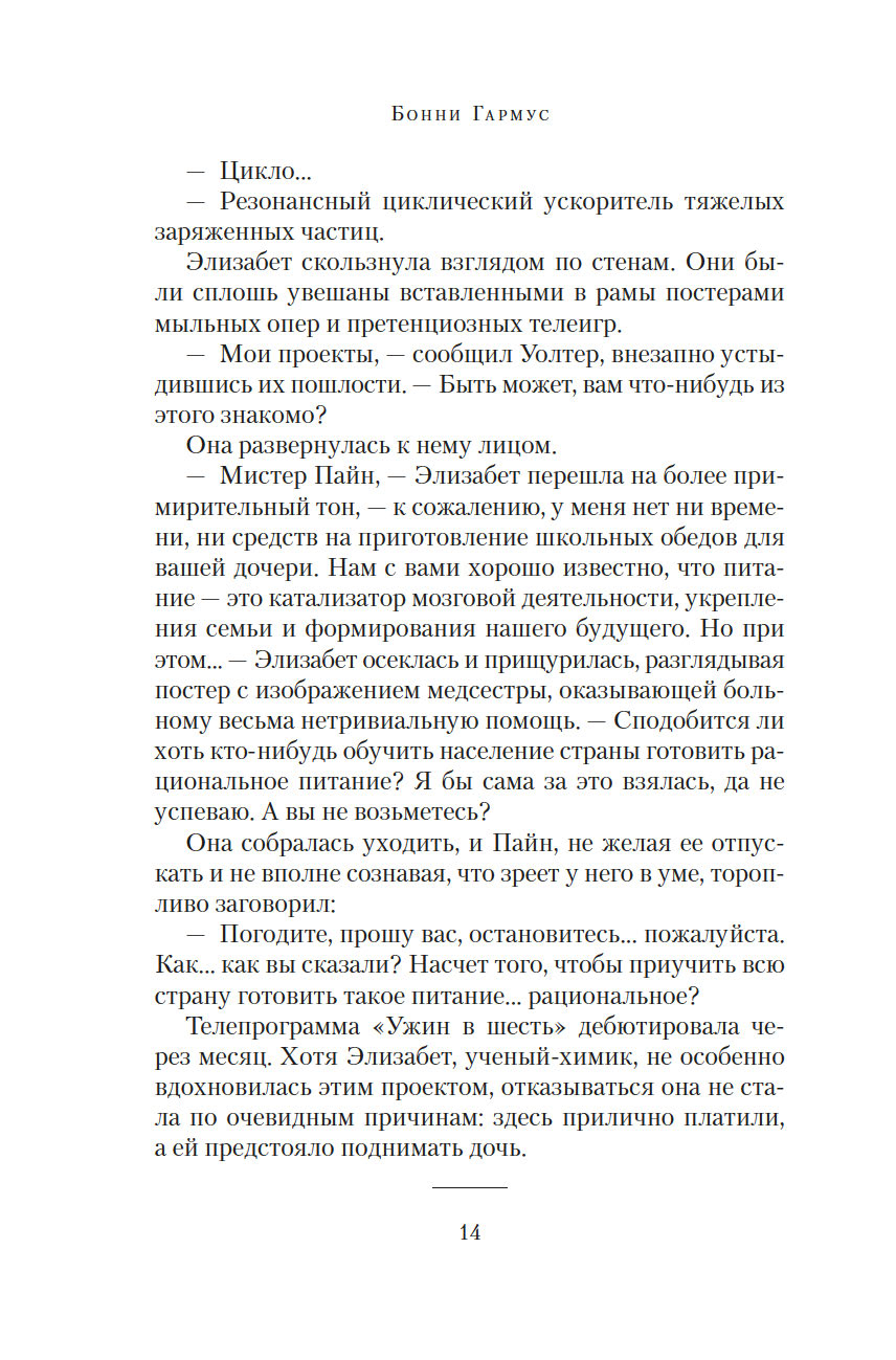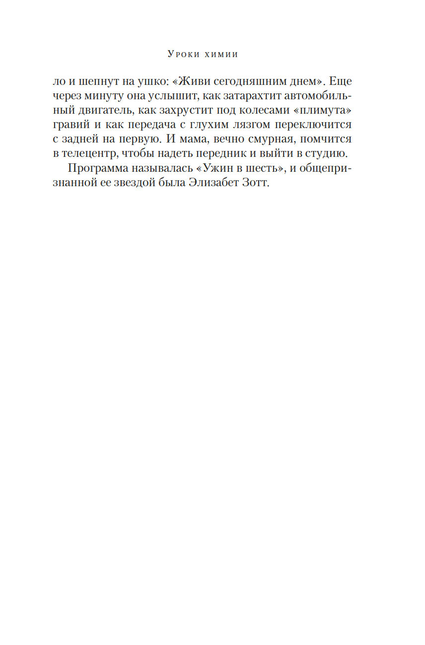 Все боятся Элизабет Зотт. Кто-то – ее ума, кто-то – остро заточенного карандаша, который она носит в прическе, а кто-то – четырнадцатидюймового ножа из ее сумочки (ведь каждый уважающий себя кулинар пользуется только своими собственными ножами). Причудливый зигзаг судьбы привел ее из Научно-исследовательского института Гастингса, где она мечтала заниматься абиогенезом (теорией возникновения жизни из неорганических веществ), на телевидение, где она ведет самую популярную в стране кулинарную передачу "Ужин в шесть". "Кулинария – это химия, – говорит она. – А химия – это жизнь. Она дает нам возможность изменить все, включая себя".