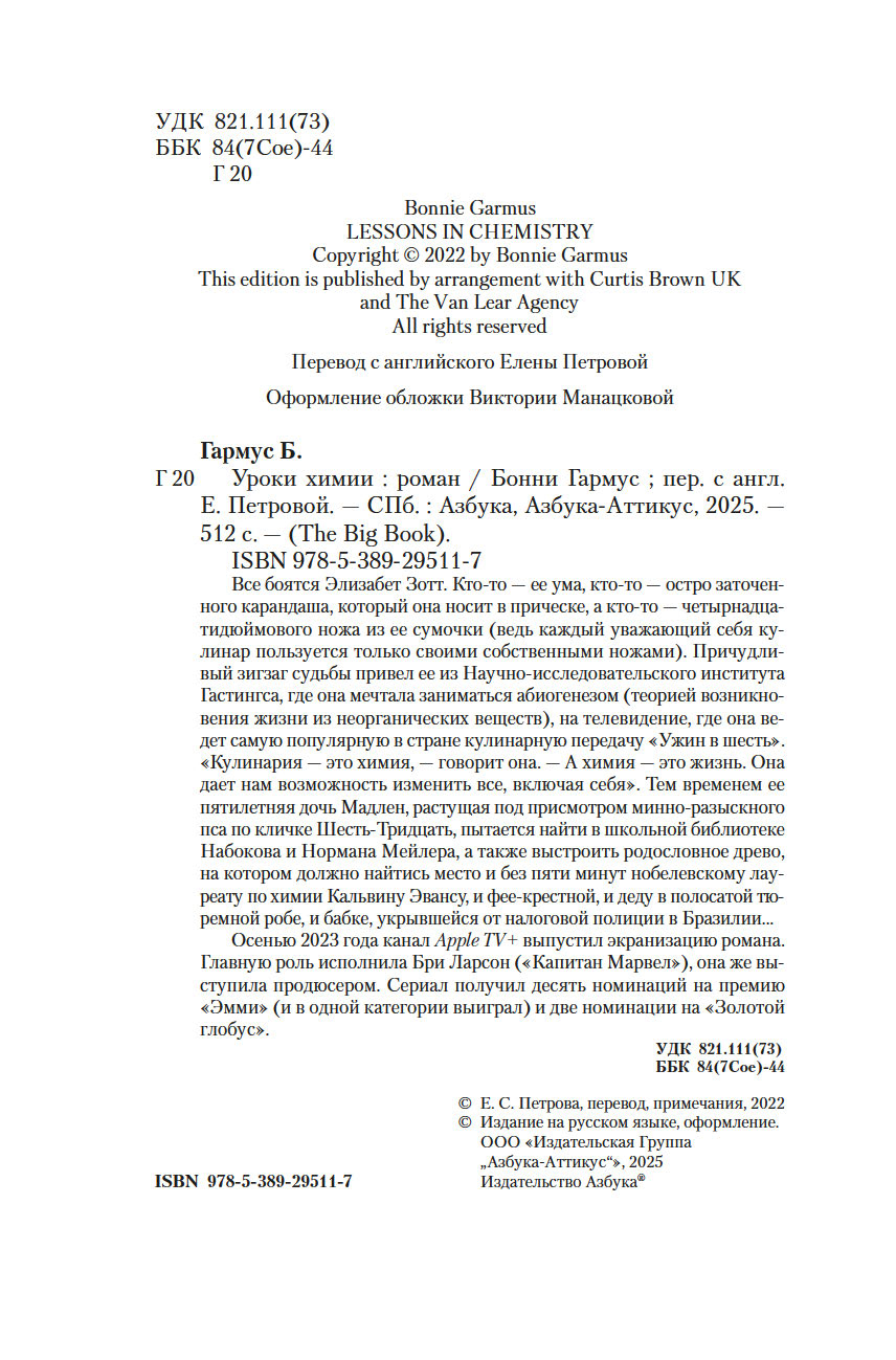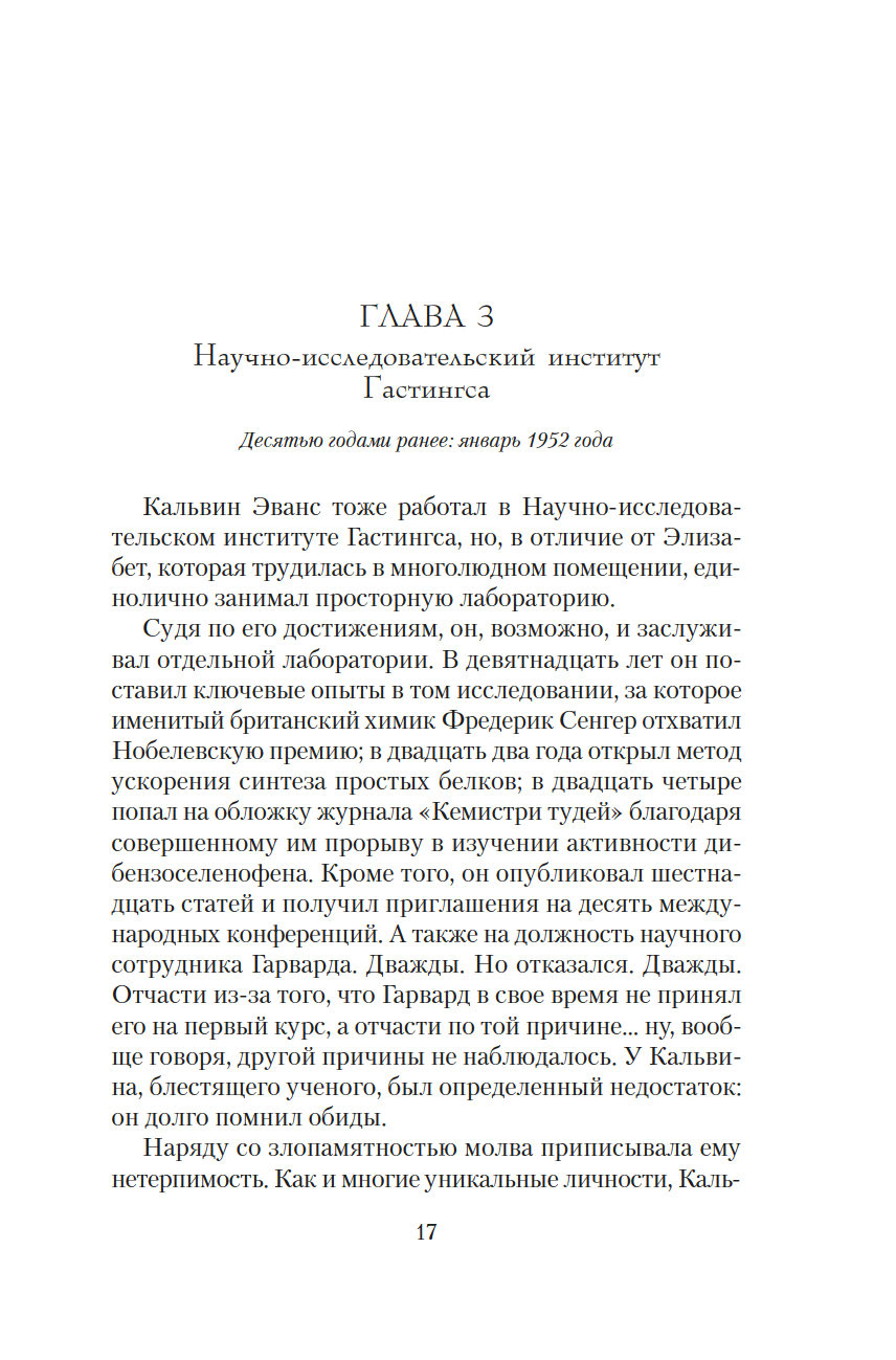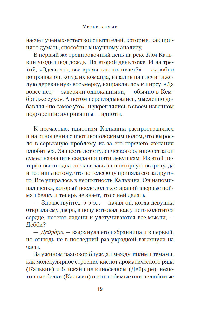 Все боятся Элизабет Зотт. Кто-то – ее ума, кто-то – остро заточенного карандаша, который она носит в прическе, а кто-то – четырнадцатидюймового ножа из ее сумочки (ведь каждый уважающий себя кулинар пользуется только своими собственными ножами). Причудливый зигзаг судьбы привел ее из Научно-исследовательского института Гастингса, где она мечтала заниматься абиогенезом (теорией возникновения жизни из неорганических веществ), на телевидение, где она ведет самую популярную в стране кулинарную передачу "Ужин в шесть". "Кулинария – это химия, – говорит она. – А химия – это жизнь. Она дает нам возможность изменить все, включая себя".