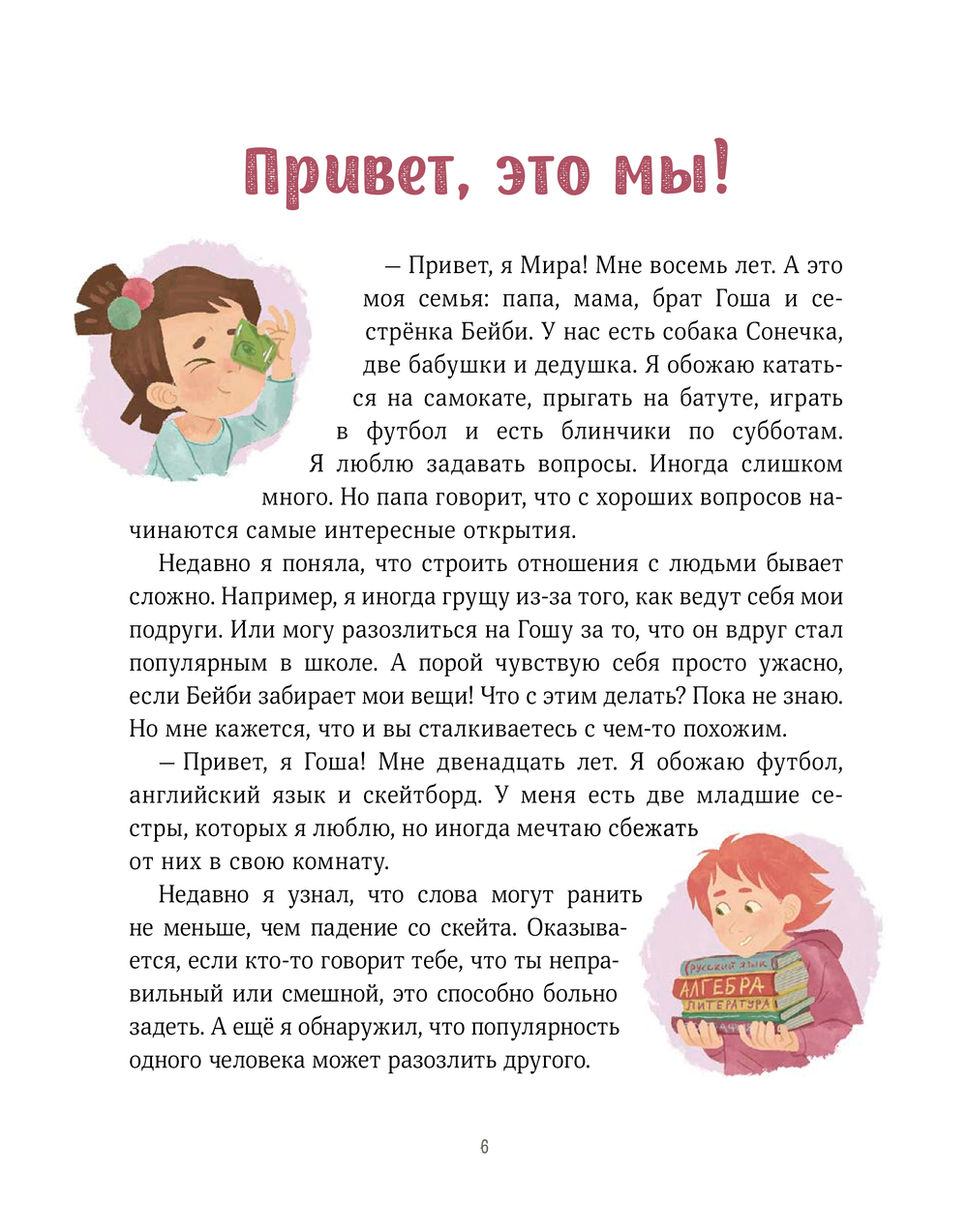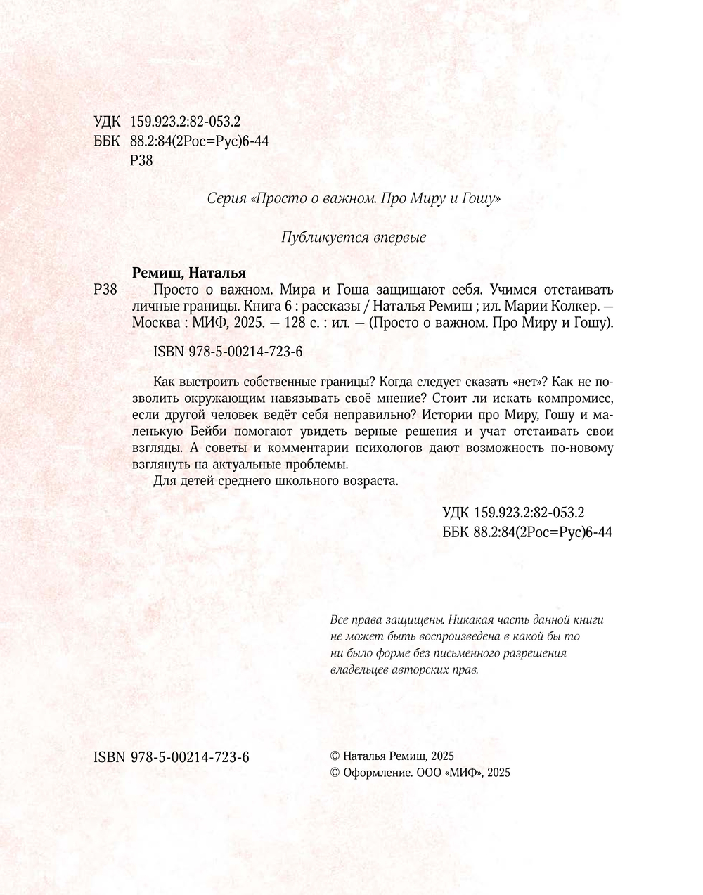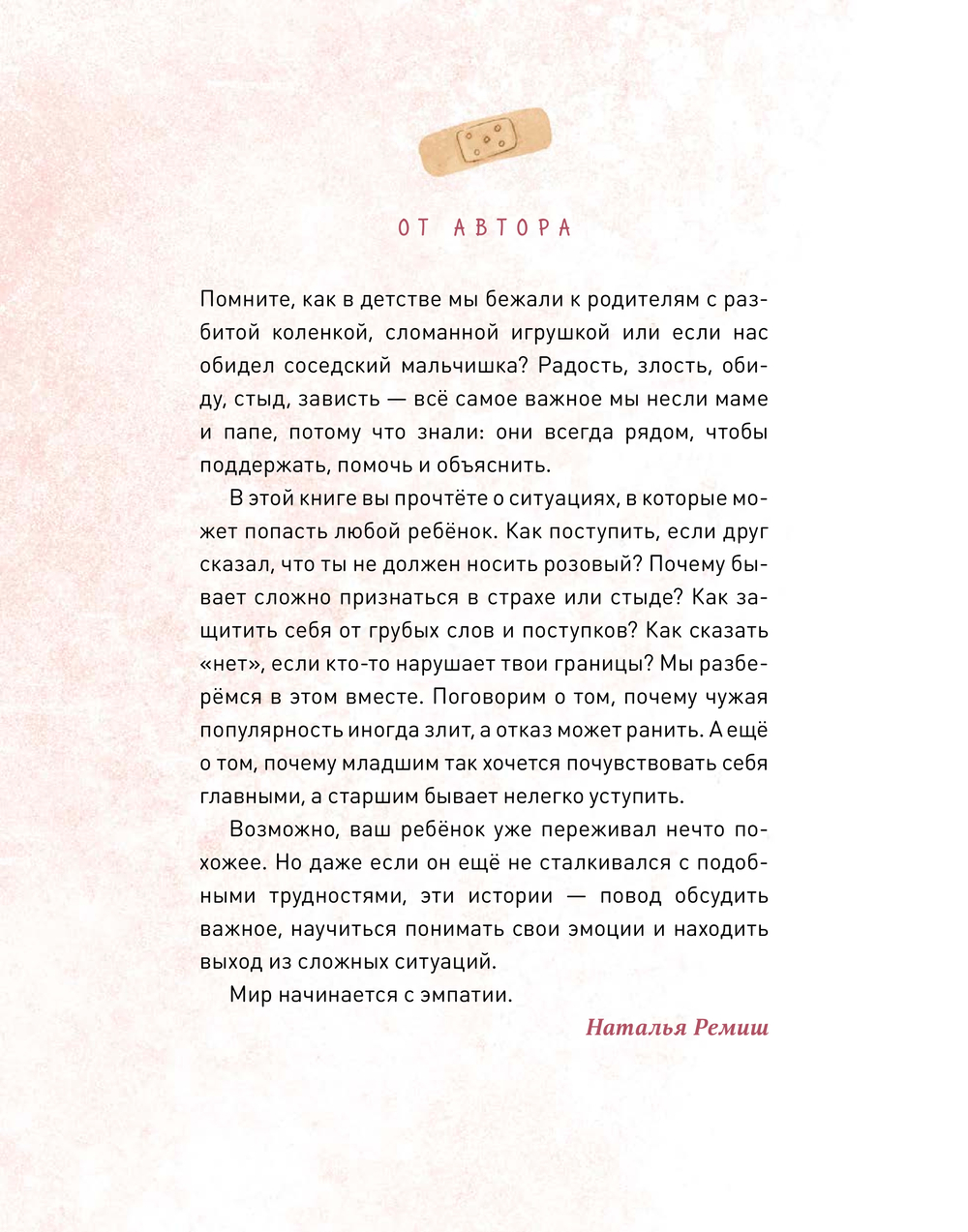 Новая книга Натальи Ремиш отвечает на эти и многие другие вопросы. Ее герои – Мира, Гоша и маленькая Бейби исследуют свои и чужие границы и учатся разрешать конфликты. А советы и комментарии психологов позволяют по-новому взглянуть на актуальные проблемы.