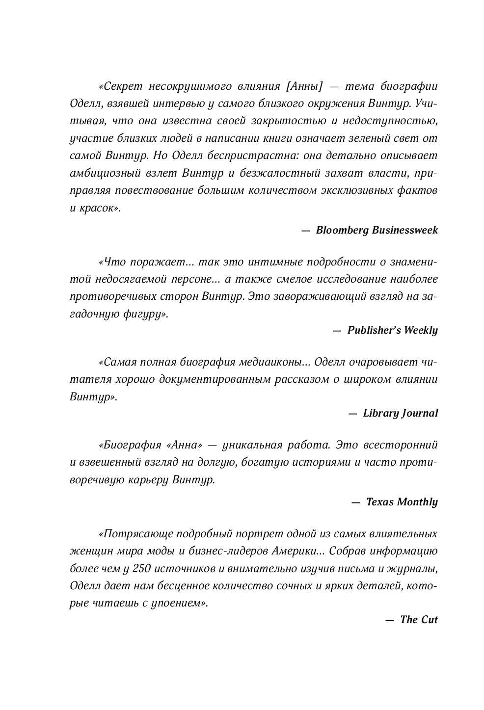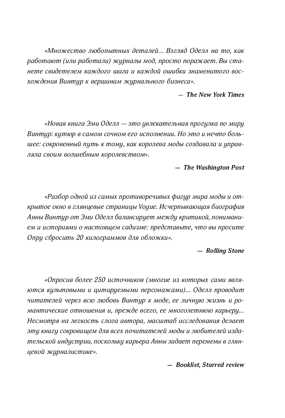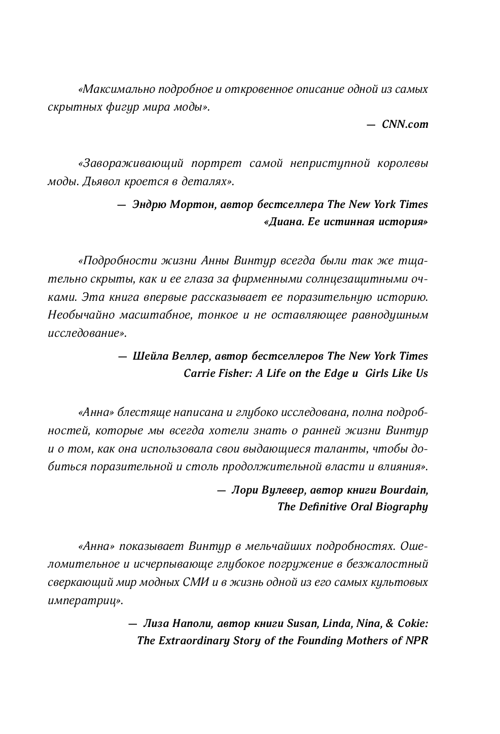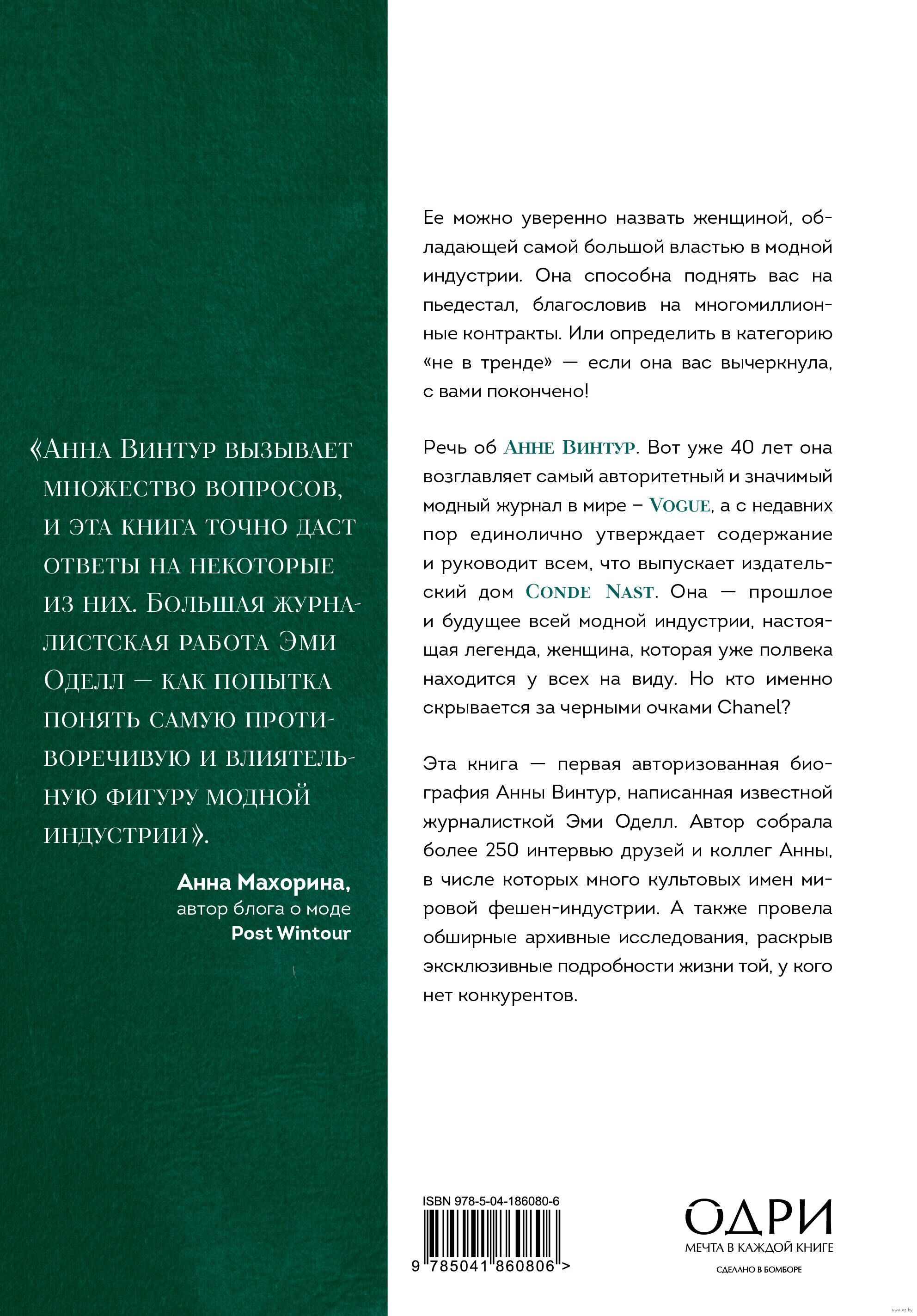 Эта книга – первая авторизированная биография Анны Винтур, написанная известной журналисткой Эми Оделл. Автор собрала более 250 интервью друзей и коллег Анны, в числе которых много культовых имен мировой фэшн-индустрии. А также провела обширные архивные исследования, раскрыв эксклюзивные подробности жизни той, у кого нет конкурентов.