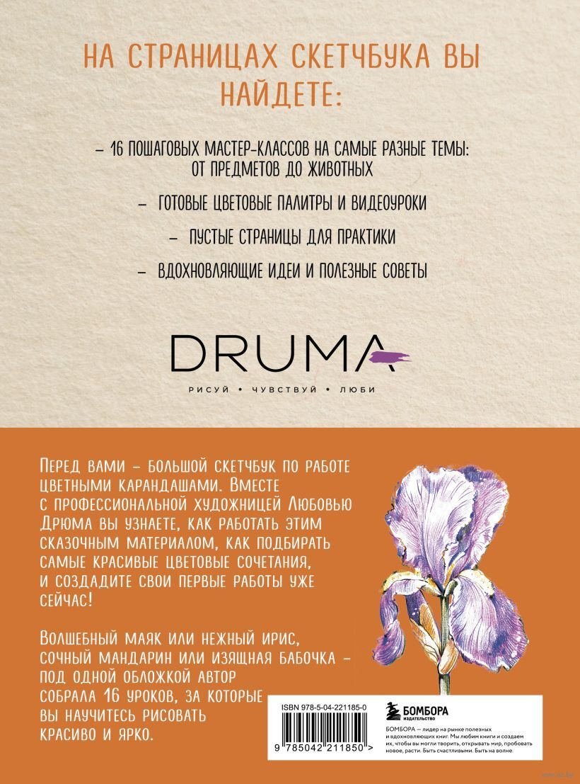 На страницах этого скетчбука вы найдете самые важные уроки по работе с самым красивым материалом – цветными карандашами. Вместе с автором вы научитесь как уверенно пользоваться этим художественным материалом, так и создавать быстрые и эффектные скетчи в разных тематиках – от food-иллюстрации до зарисовок с животными. После каждого урока в скетчбуке отведены пустые странички для практики и совершенствования своей техники, а по qr-кодам вы всегда можете посмотреть видео с процессом создания каждой работы.