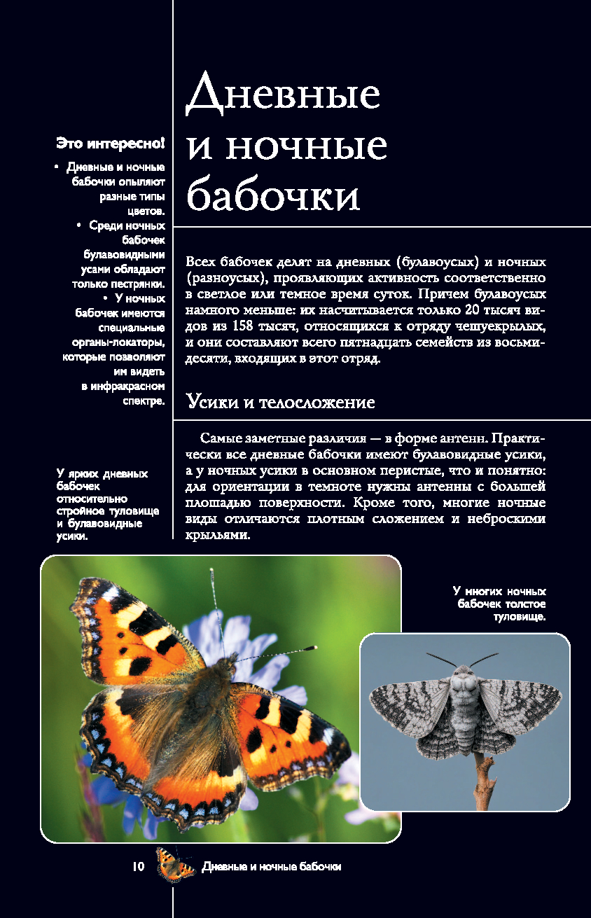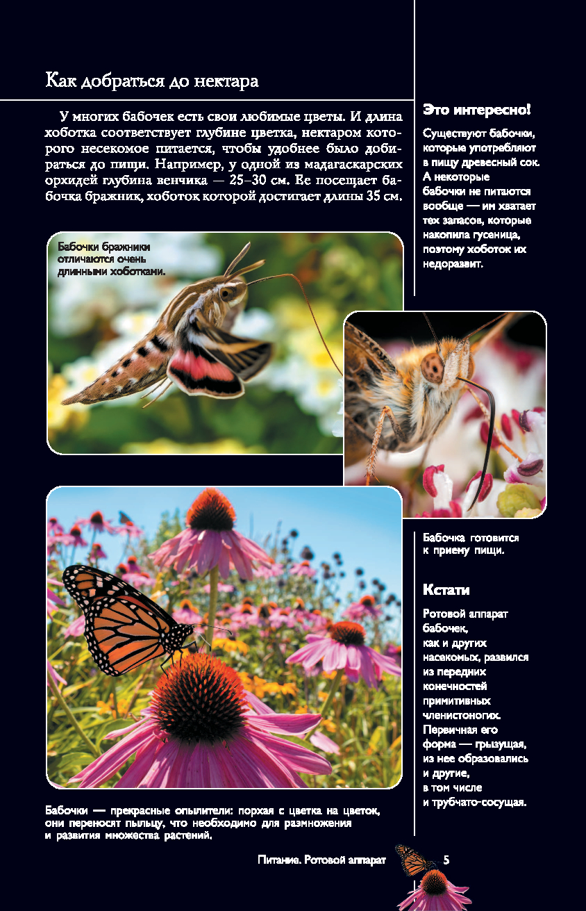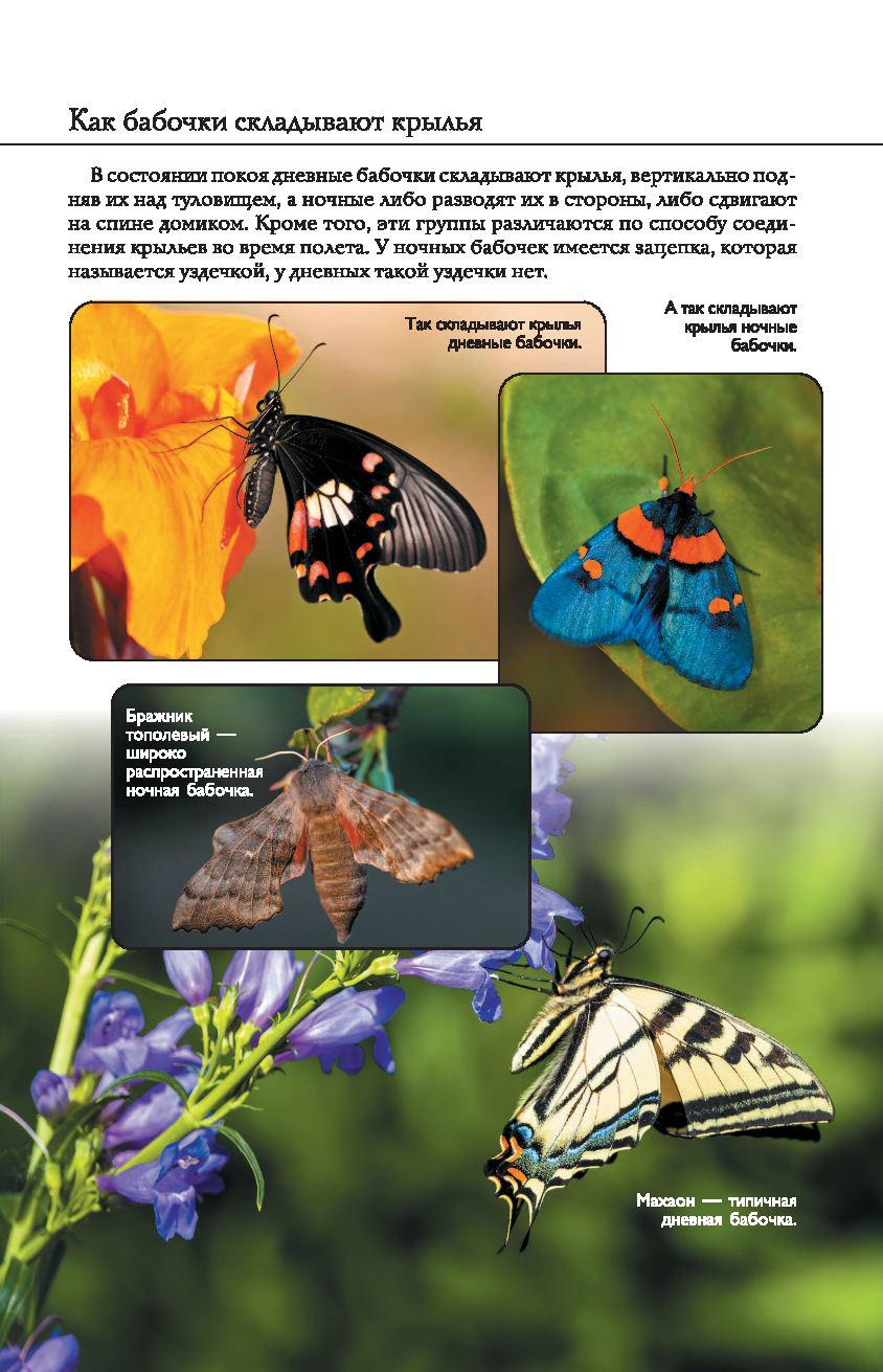 На страницах этого прекрасно иллюстрированного издания представлены бабочки – грациозные чешуекрылые насекомые, которые знакомы каждому с детства. Но знаете ли вы, насколько выносливы эти хрупкие создания, как они ориентируются в пространстве и на что способны, защищаясь от врагов? Известно ли вам, что среди них нередко встречаются не только полезные для нашей природы виды, но и весьма опасные? Узнать больше об этих насекомых вам поможет данная книга. Здесь приведено описание разных видов бабочек, в том числе их особенности и образ жизни, размеры, места обитания и даже охранный статус. А множество интересных фактов и уникальных фотографий, позволяющих рассмотреть этих насекомых в увеличенном виде во всех подробностях, превратят ваше знакомство с удивительным миром бабочек в увлекательное путешествие!