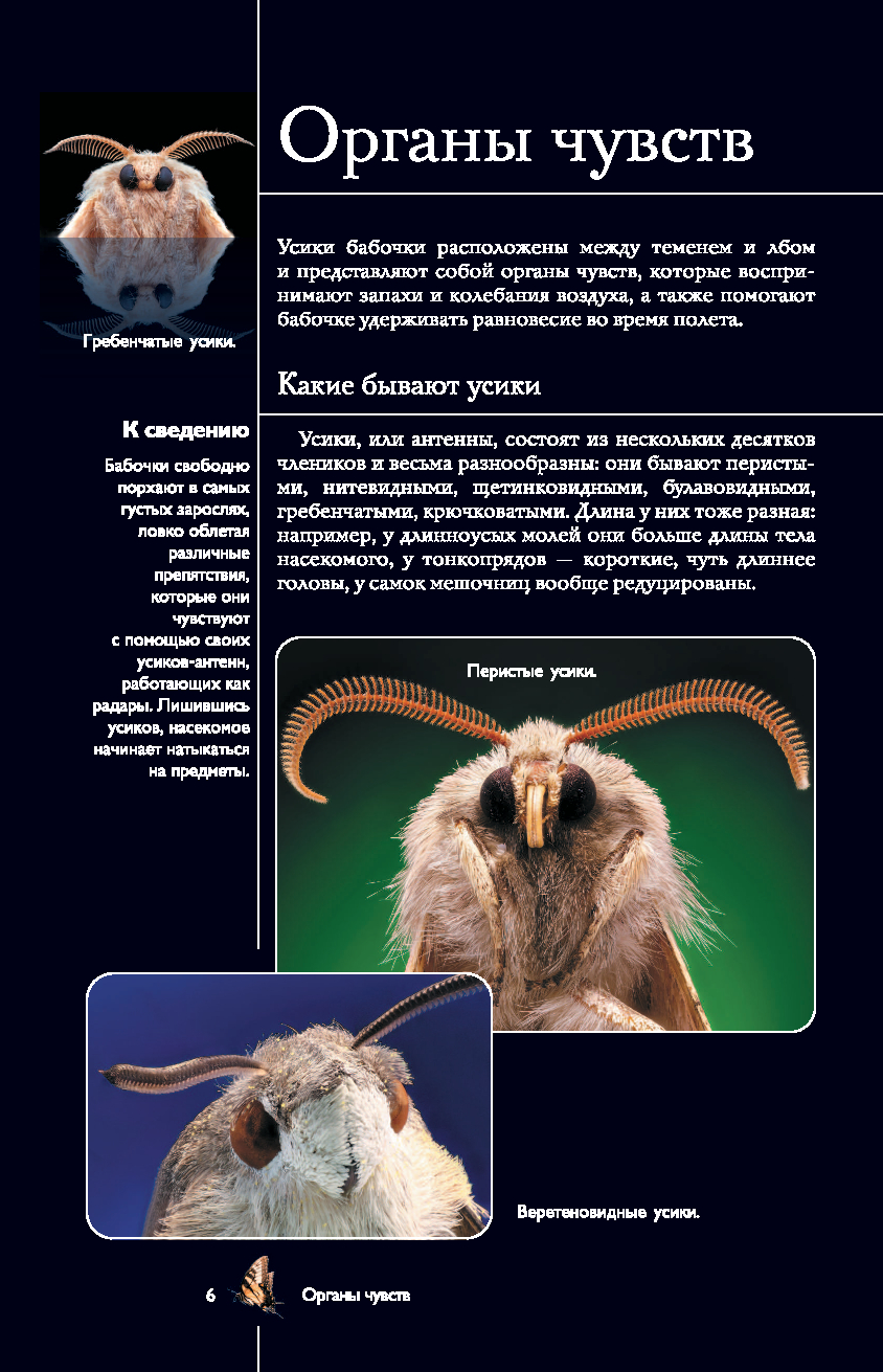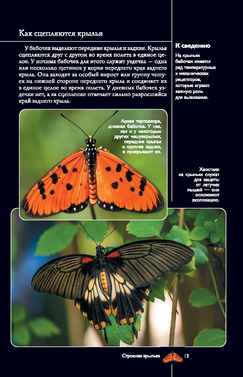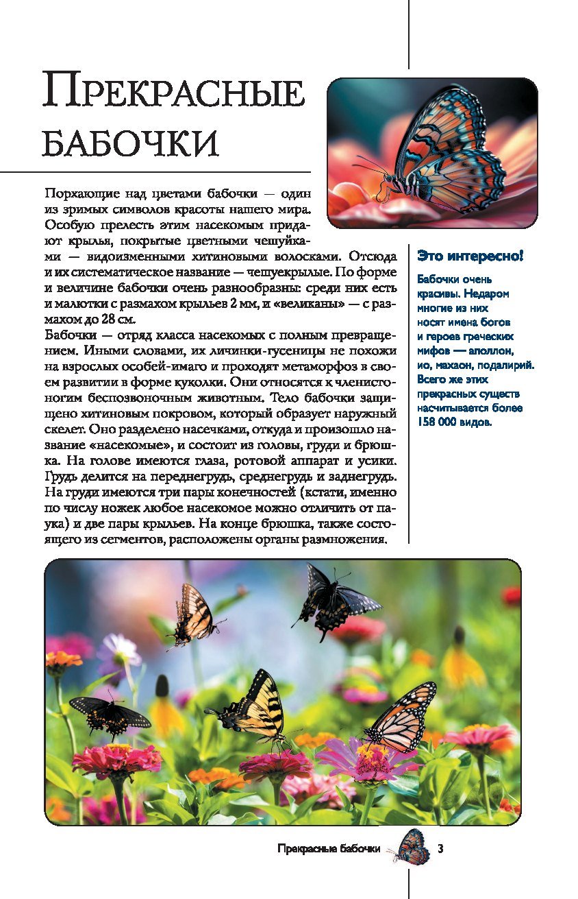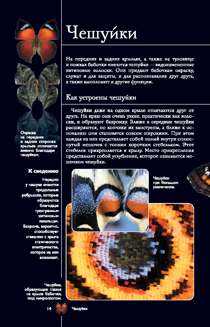На страницах этого прекрасно иллюстрированного издания представлены бабочки – грациозные чешуекрылые насекомые, которые знакомы каждому с детства. Но знаете ли вы, насколько выносливы эти хрупкие создания, как они ориентируются в пространстве и на что способны, защищаясь от врагов? Известно ли вам, что среди них нередко встречаются не только полезные для нашей природы виды, но и весьма опасные? Узнать больше об этих насекомых вам поможет данная книга. Здесь приведено описание разных видов бабочек, в том числе их особенности и образ жизни, размеры, места обитания и даже охранный статус. А множество интересных фактов и уникальных фотографий, позволяющих рассмотреть этих насекомых в увеличенном виде во всех подробностях, превратят ваше знакомство с удивительным миром бабочек в увлекательное путешествие!