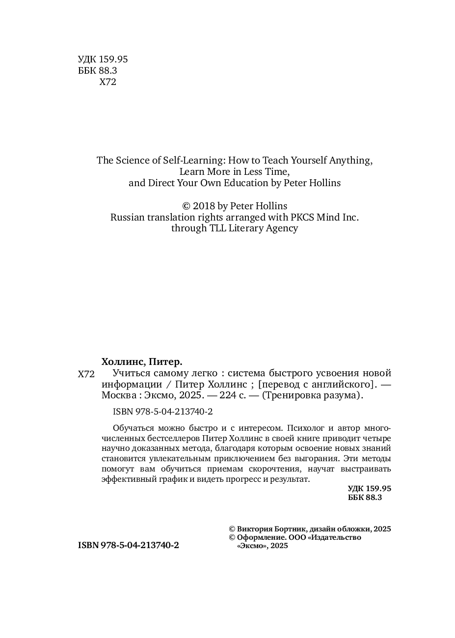 Благодаря этой книге учеба перестанет быть скучной рутиной, а процесс освоения новых знаний станет эффективнее и быстрее. В ней психолог и автор многочисленных бестселлеров Питер Холлинс рассказывает про 4 научно доказанных метода скоростного обучения. С их помощью объем вашей долгосрочной памяти увеличится в разы, а изучение нового материала превратится в увлекательное приключение.