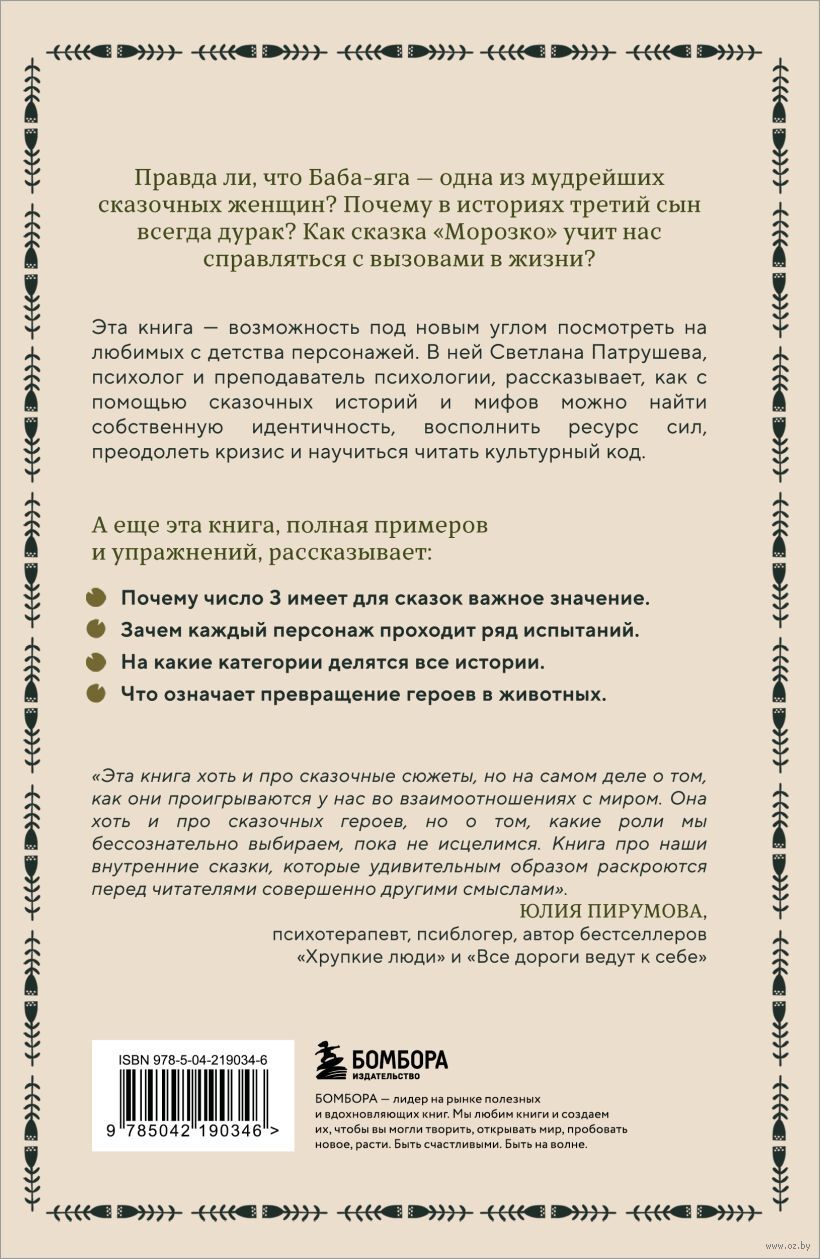 Эта книга – возможность под новым углом посмотреть на любимых с детства персонажей. В ней Светлана Патрушева, психолог и преподаватель психологии, рассказывает, как с помощью сказочных историй и мифов можно найти собственную идентичность, восполнить ресурс сил, преодолеть кризис и научиться читать культурный код.