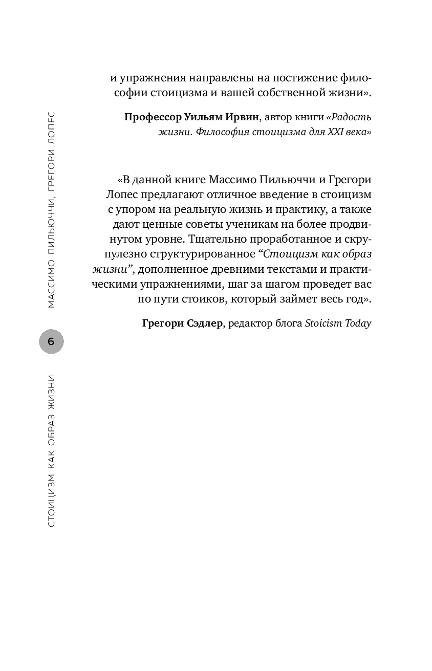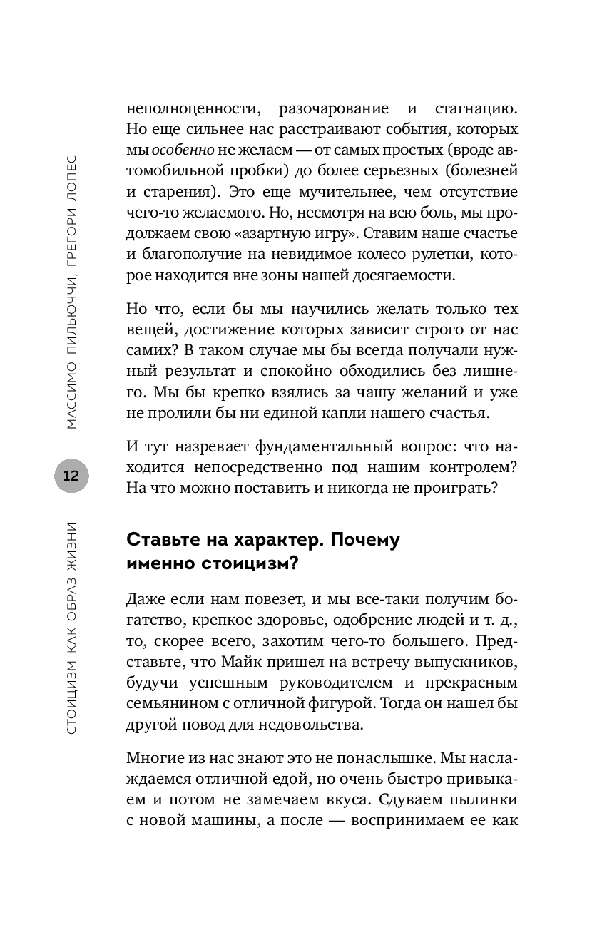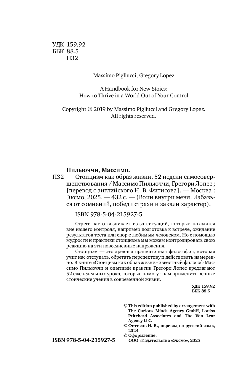Известный философ Массимо Пильюччи и опытный практик Грегори Лопес предлагают 52 еженедельных урока, которые помогут нам применить вечные стоические учения в современной жизни. Аргументами автора служат примеры исторических стоиков и современные исследования, подтверждающие эффективность этих техник в повышении психологической устойчивости.