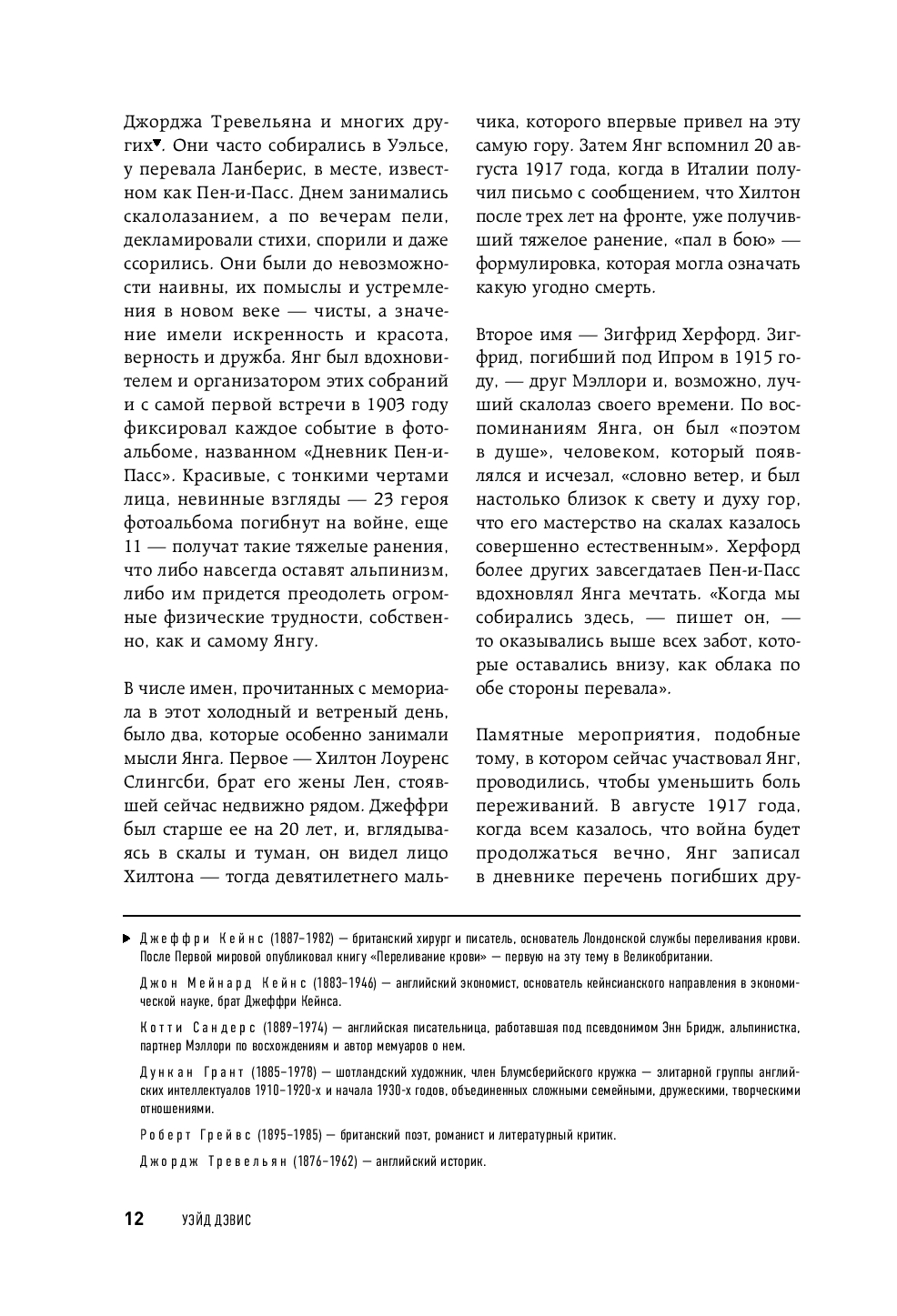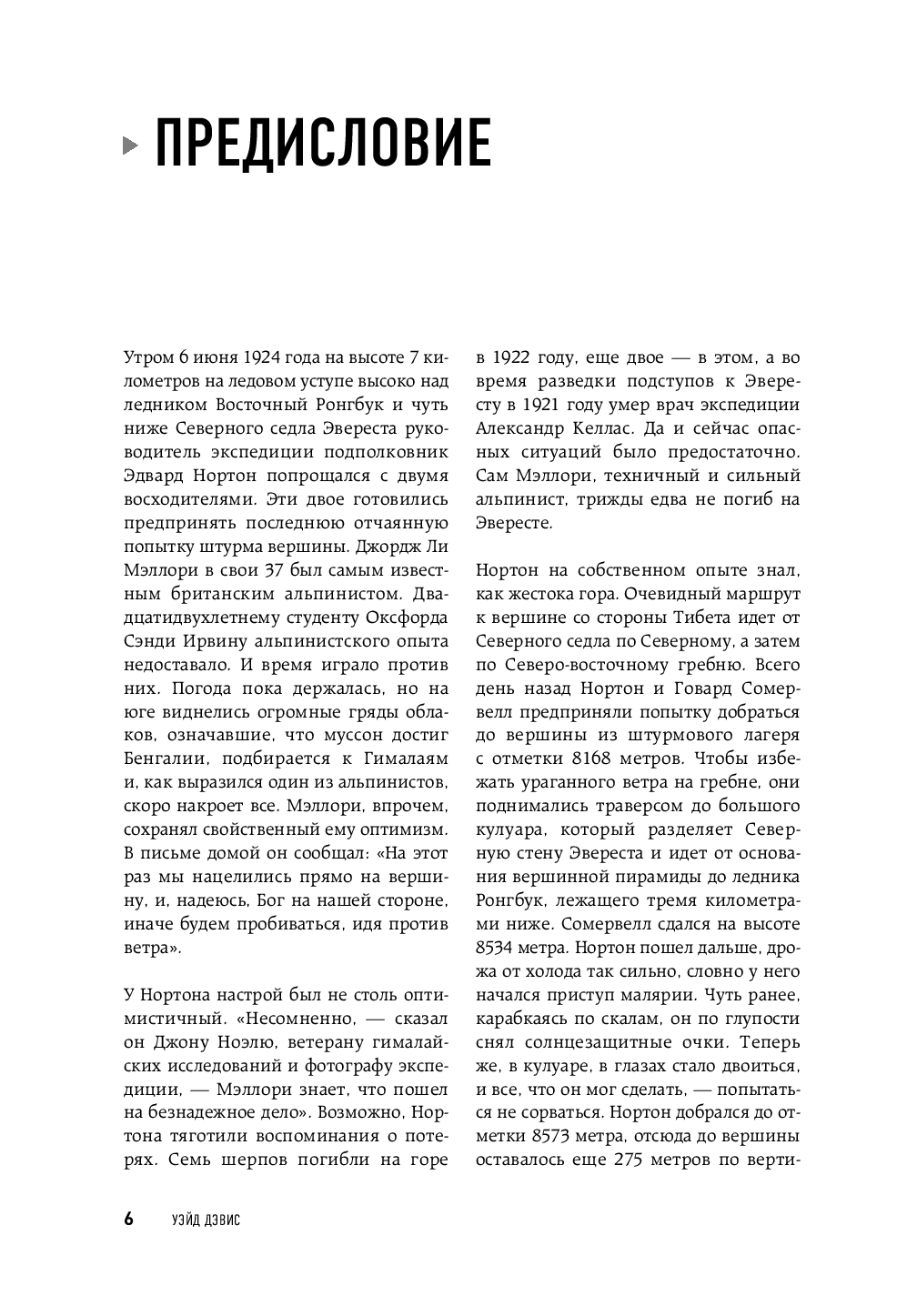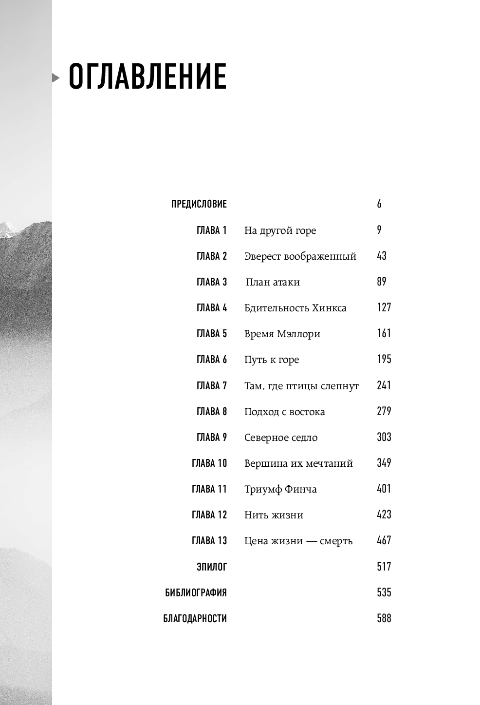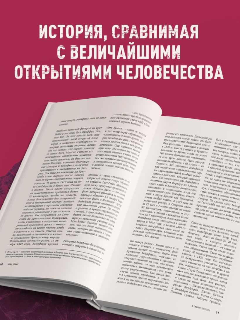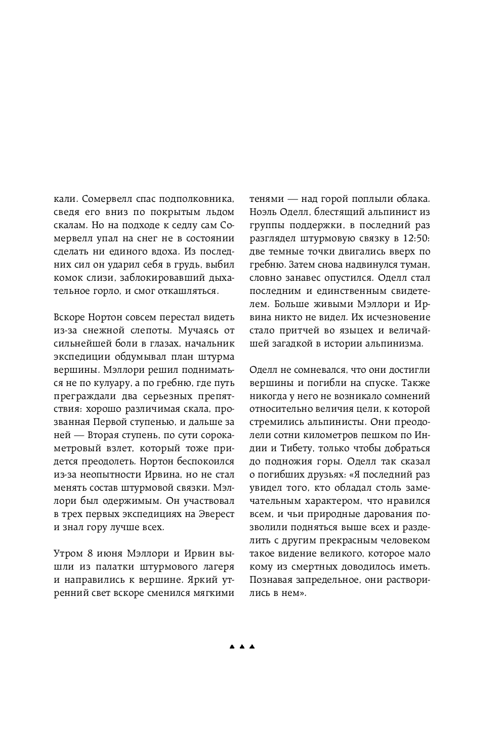 Джордж Мэллори и Эндрю Ирвин были участниками британской экспедиции на Эверест в 1924 году, стремясь первыми в мире достичь его вершину. 6 июня 1924 года альпинисты отправились на штурм из последнего лагеря на высоте около 8 170 метров, 8 июня команда была замечена приблизительно в 240 метрах от вершины, после чего Мэллори и Ирвин навсегда исчезли. До сих пор доподлинно неизвестно, достигли ли они вершины или нет. Эта книга об истории альпинизма, амбициях и, конечно, любви к горам.