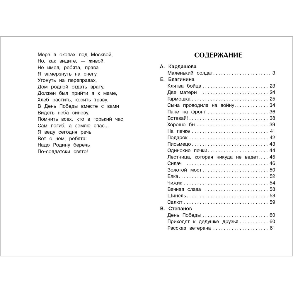 Анна Кардашова в стихотворении "Маленький солдат" расскажет о мальчике Пете, который оказался в рядах защитников Брестской крепости. А стихи Елены Благининой расскажут о том, чем жили дети в городах и селах, во что верили и как ждали домой с победой своих родных.