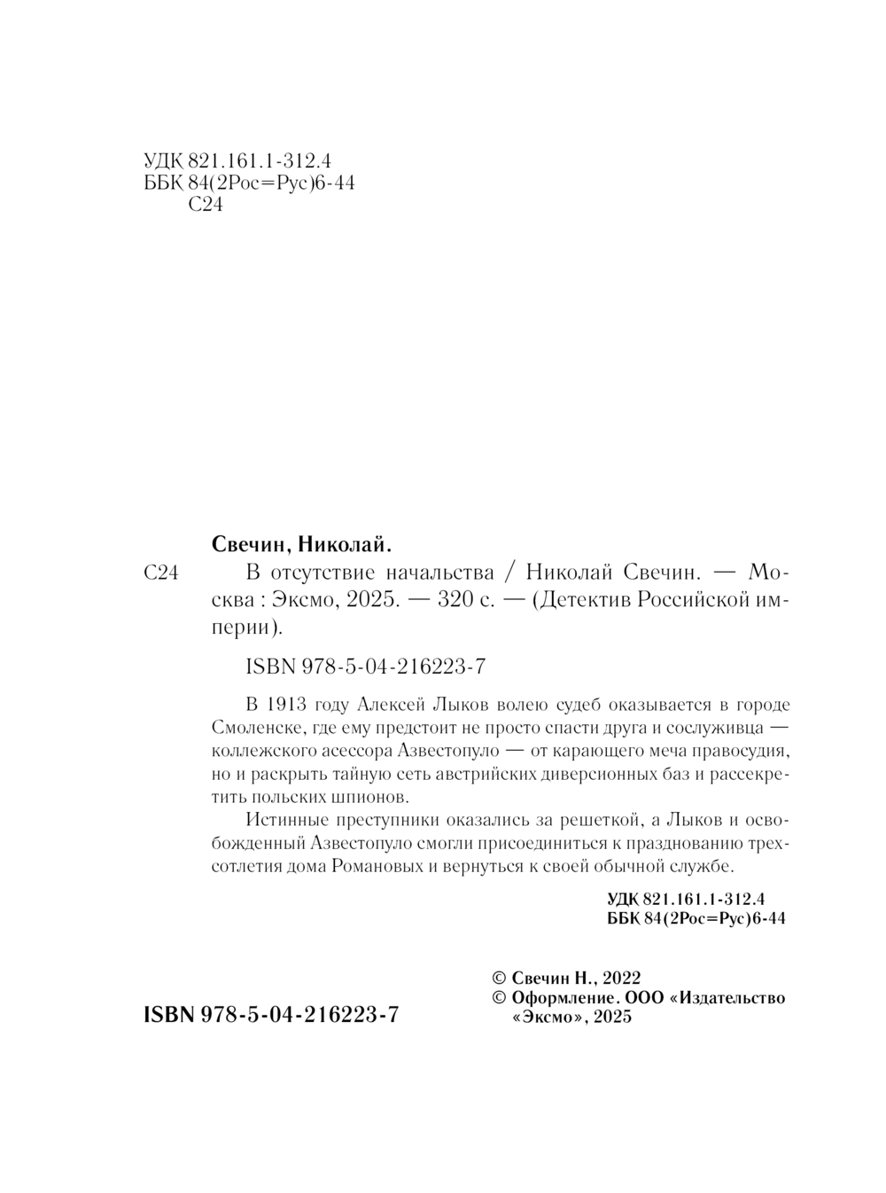 В 1913 году Алексей Лыков волею судеб оказывается в городе Смоленске, где ему предстоит не просто спасти друга и сослуживца – коллежского асессора Азвестопуло – от карающего меча правосудия, но и раскрыть тайную сеть австрийских диверсионных баз и рассекретить польских шпионов.