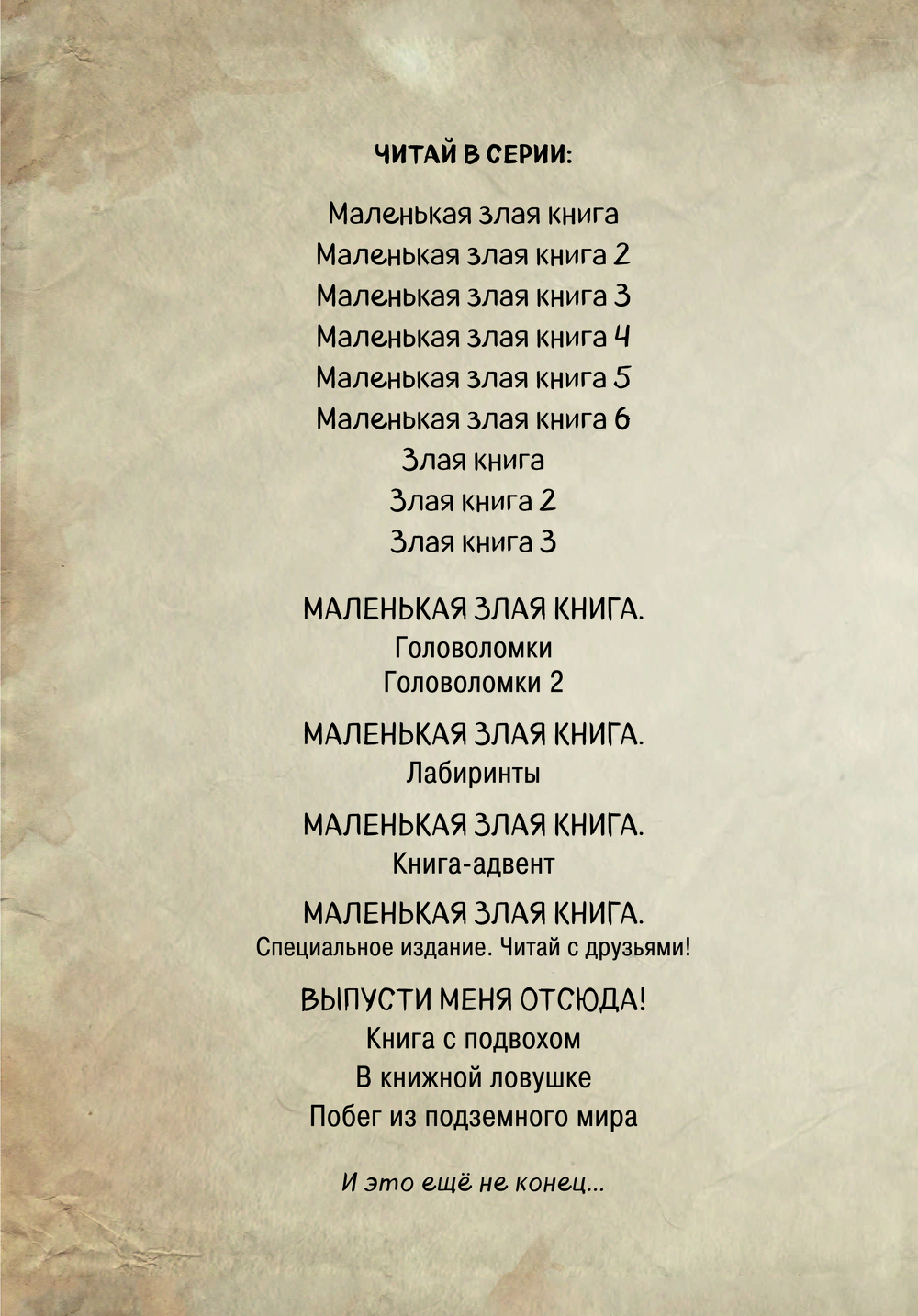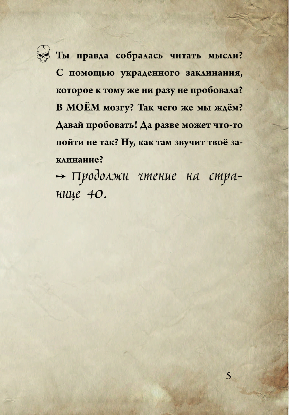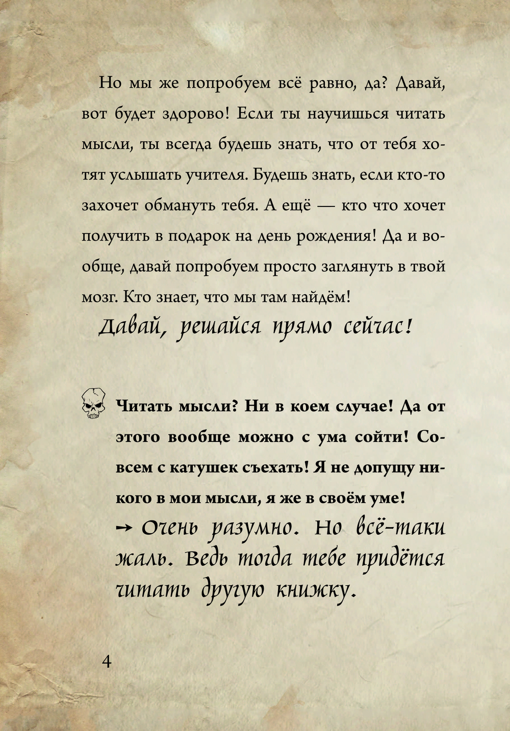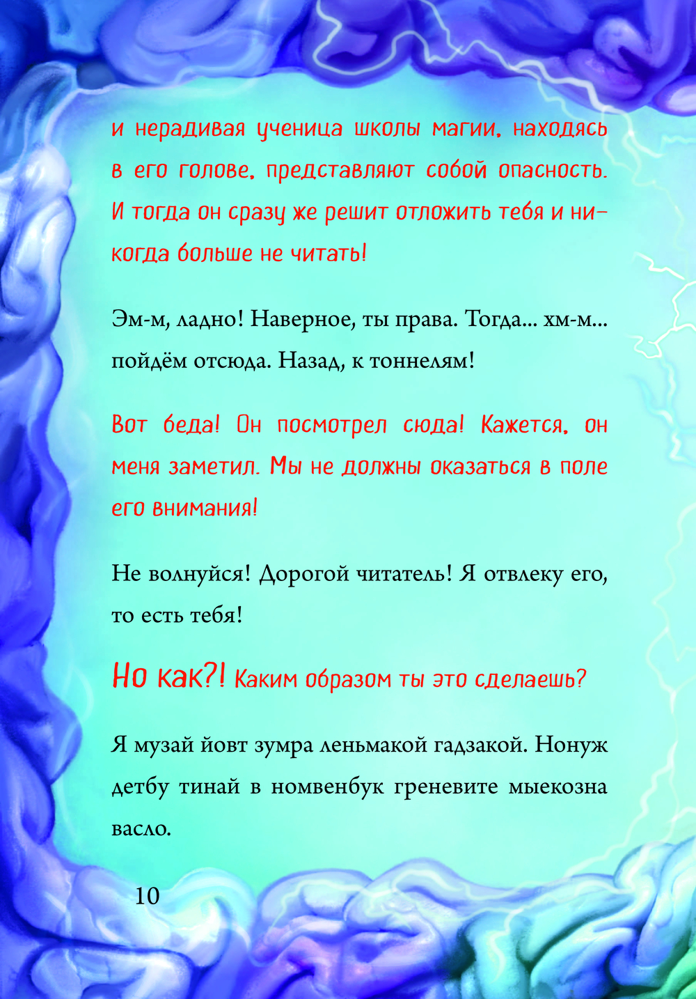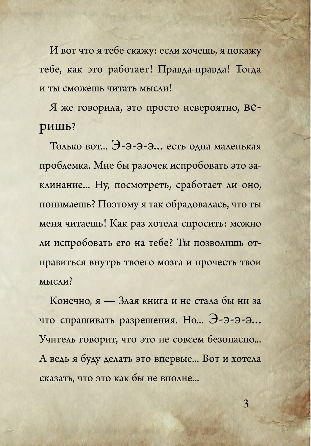 Секрет успеха серии в том, что книга ведёт живой, юмористический диалог с читателем, рассказывает ему страшные истории и приглашает в авантюрное приключение. Чтобы пройти всю книгу до конца (принимая решения на сюжетных развилках и переходя по разным страницам не по порядку), нужно разгадать немало загадок и головоломок, которые развивают внимание и мышление. В этот раз злюка решила проверить, сможет ли она с помощью заклинания проникать в мозг других людей и читать их мысли... Чем закончится этот эксперимент?