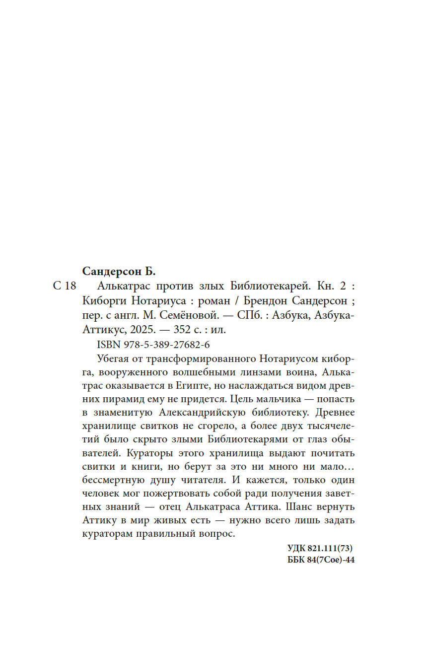 Убегая от трансформированного Нотариусом киборга, вооруженного волшебными линзами воина, Алькатрас оказывается в Египте, но наслаждаться видом древних пирамид ему не придется. Цель мальчика – попасть в знаменитую Александрийскую библиотеку. Древнее хранилище свитков не сгорело, а более двух тысячелетий было скрыто злыми Библиотекарями от глаз обывателей. Кураторы этого хранилища выдают почитать свитки и книги, но берут за это ни много ни мало… бессмертную душу читателя. И кажется, только один человек мог пожертвовать собой ради получения заветных знаний – отец Алькатраса Аттика. Шанс вернуть Аттику в мир живых есть – нужно всего лишь задать кураторам правильный вопрос.