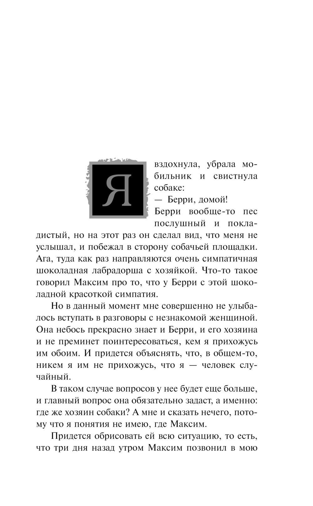 Что делать, если сосед попросил приютить на пару дней свою собаку, а затем бесследно исчез? Конечно, искать его! Даже когда знаешь о нем совсем немного: имя, номер телефона, внешность. Однако ситуация осложняется с каждым днем: Максима разыскивают какие-то очень подозрительные люди. Тайны прошлого тем временем всплывают в самый неподходящий момент, угрожая покою искательницы приключений, а главное – ее жизни…
