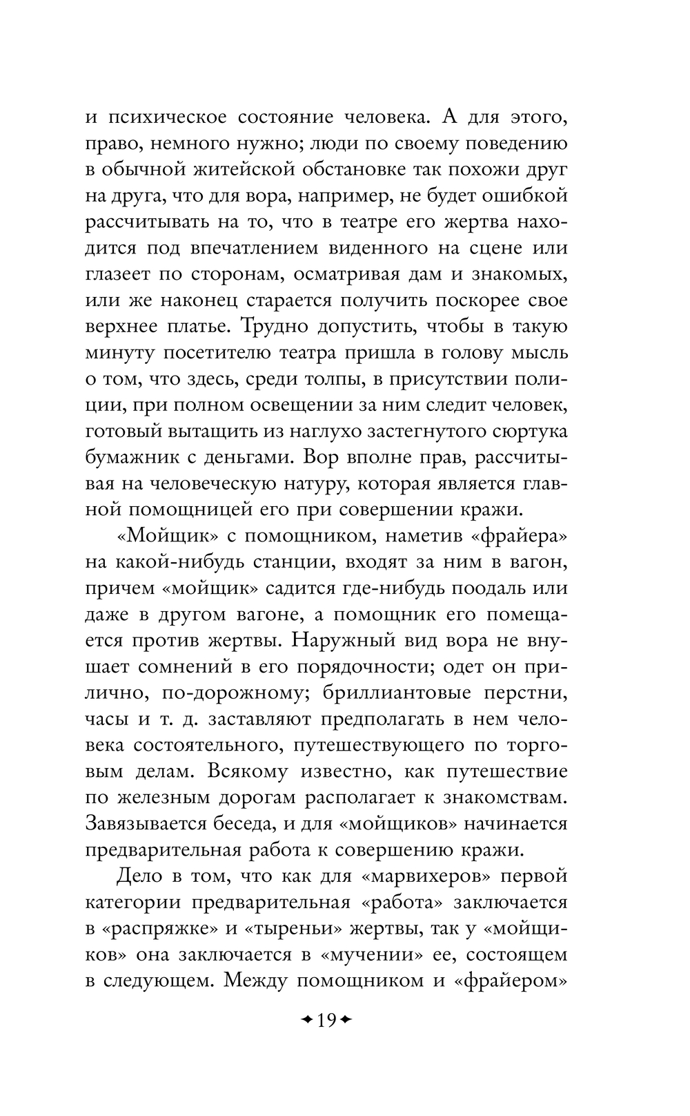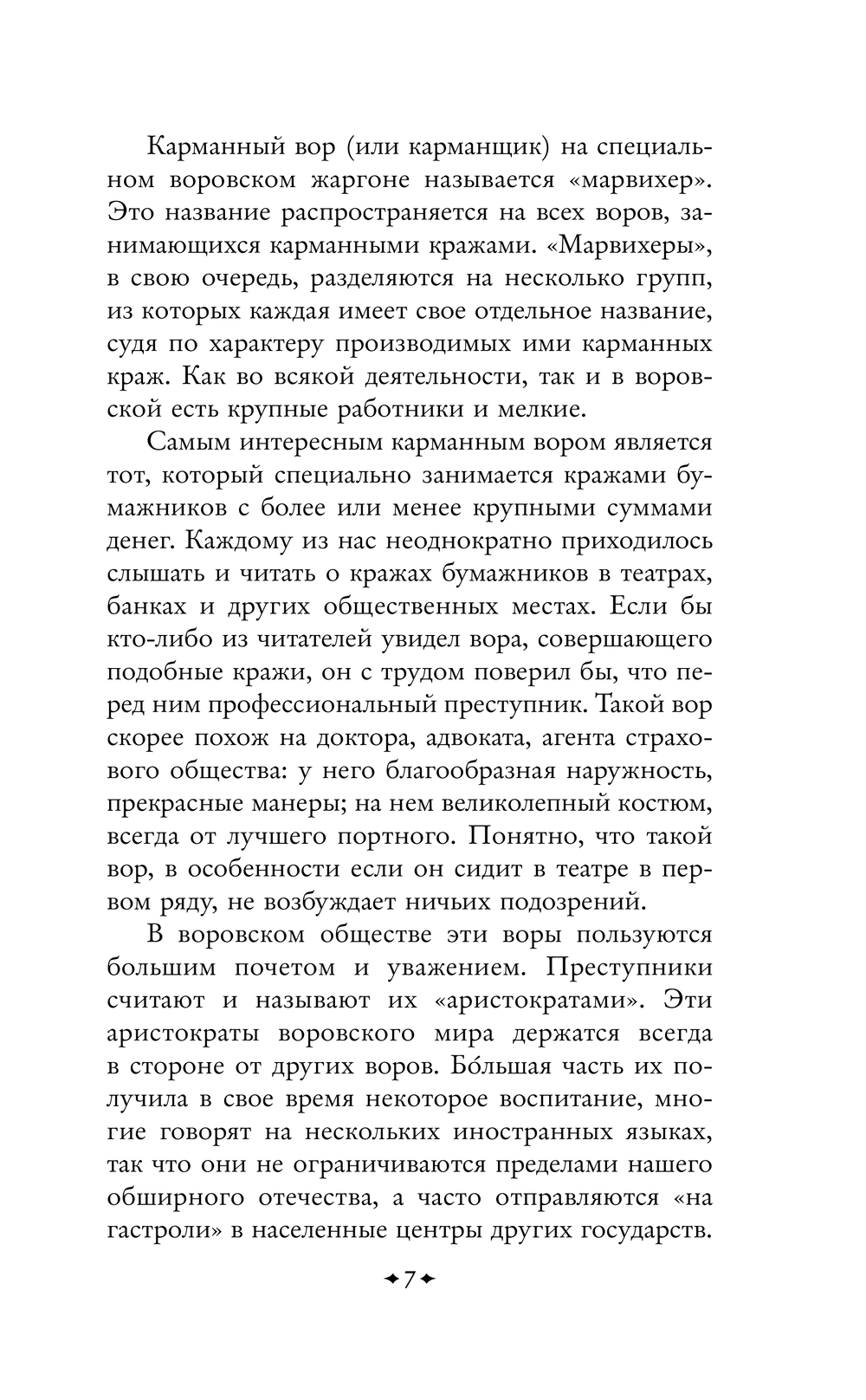 Книга детально исследует методы работы профессиональных преступников: от карманников ("марвихеров") и взломщиков ("скакарей") до мошенников и конокрадов. Автор раскрывает воровские "профессии", их жаргон, техники и даже своеобразную "этику". Особое внимание уделено легендарным фигурам, таким как Сонька Золотая Ручка, чьи аферы вошли в криминальный фольклор.