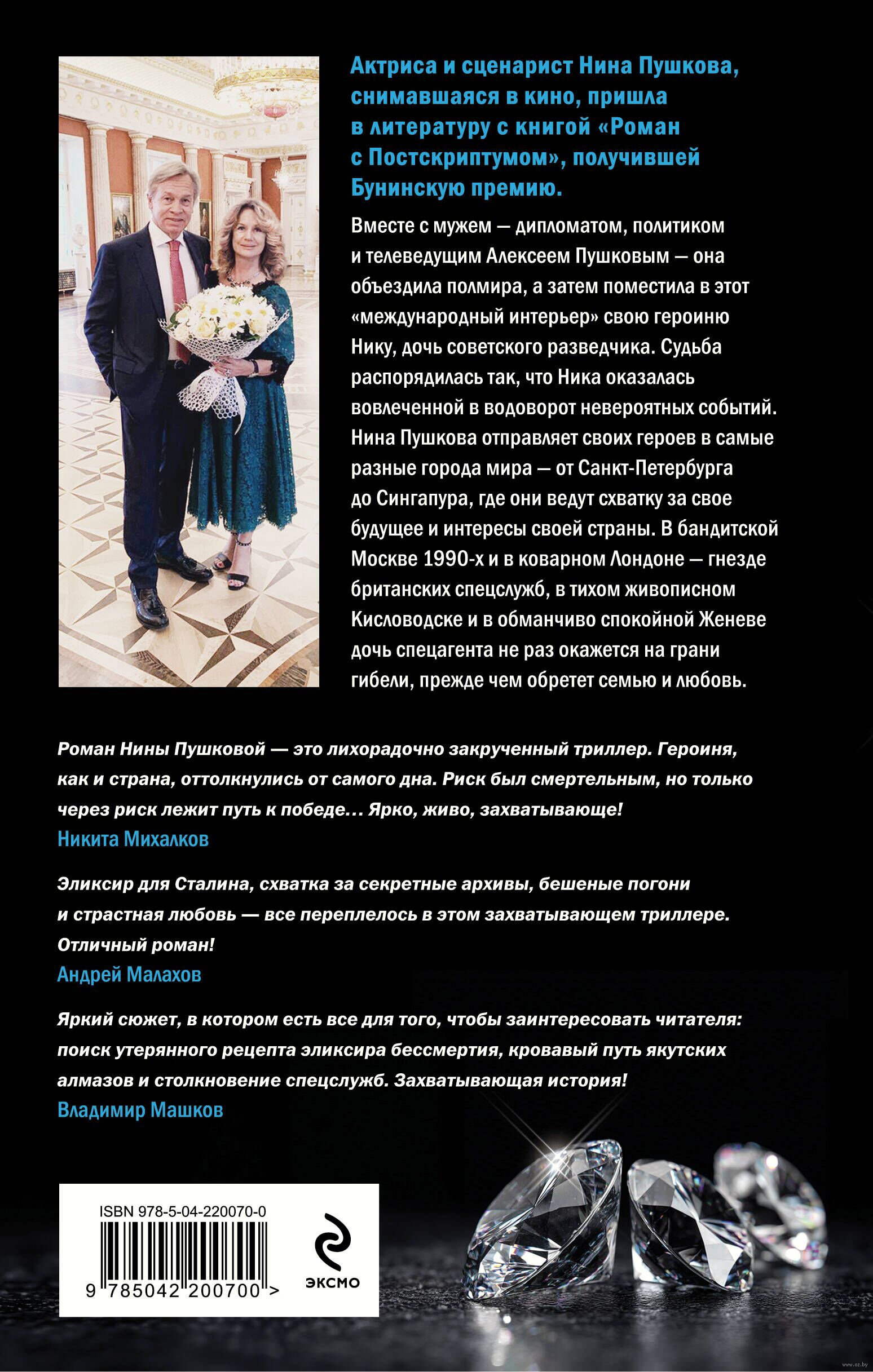 Спецагент разведки Сергей Францев вместе с дочерью Никой спешно покидают Лондон, оставляя за собой два трупа и идущий по следам Скотленд-Ярд. В России начала 90-ых, где царят большие деньги и кровавый хаос, кажется, легко затеряться. Но это иллюзия. От Лондона до Москвы, от Давоса до Токио, от Киева до Женевы идёт жестокая схватка за бесценные якутские алмазы и гонка за тайными архивами личного врача Сталина. На кону – не только победа, на кону сама жизнь. Об этом – в новом захватывающем романе Нины Пушковой, автора "Романа с Постскриптумом" и "Богини победы", переведённых в нескольких странах Европы.
