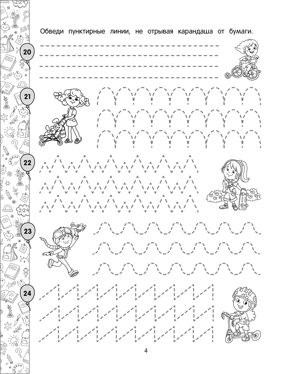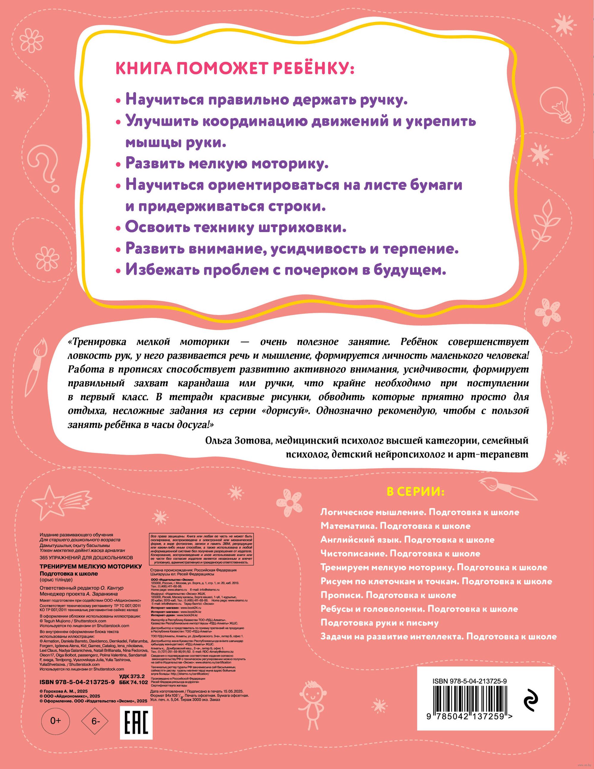 В рабочей тетради более 365 упражнений для тренировки мелкой моторики у детей от 5 лет, рассчитанных на каждый день года. Это способствует равномерному распределению учебно-игровой нагрузки и формированию положительного отношения ребёнка к обучению. Дошкольник потренируется обводить линии, рисунки, элементы букв, штриховать, дорисовывать детали изображений и рисовать картинки по образцу. Книга поможет ребёнку развить графические навыки, координацию движений, подготовить руку к письму, стать внимательным, усидчивым и аккуратным.