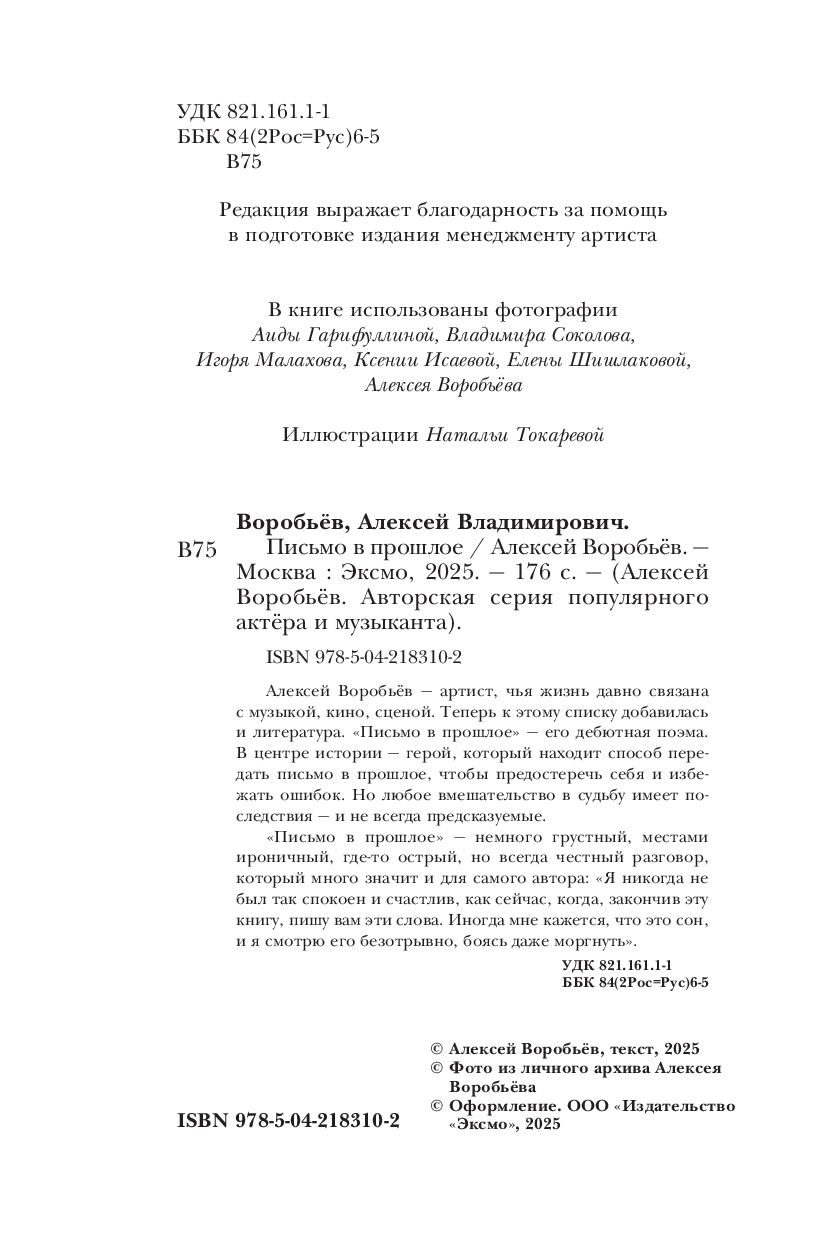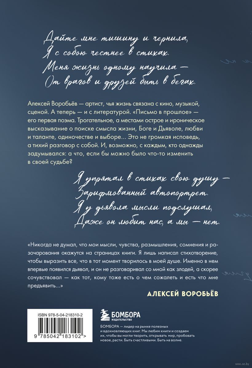 Алексей Воробьёв – артист, чья жизнь давно связана с музыкой, кино, сценой. Теперь к этому списку добавилась и литература. "Письмо в прошлое" – его дебютная поэма. В центре истории – герой, который находит способ передать письмо в прошлое, чтобы предостеречь себя и избежать ошибок. Но любое вмешательство в судьбу имеет последствия – и не всегда предсказуемые.