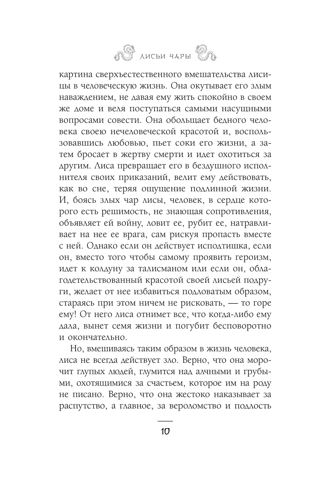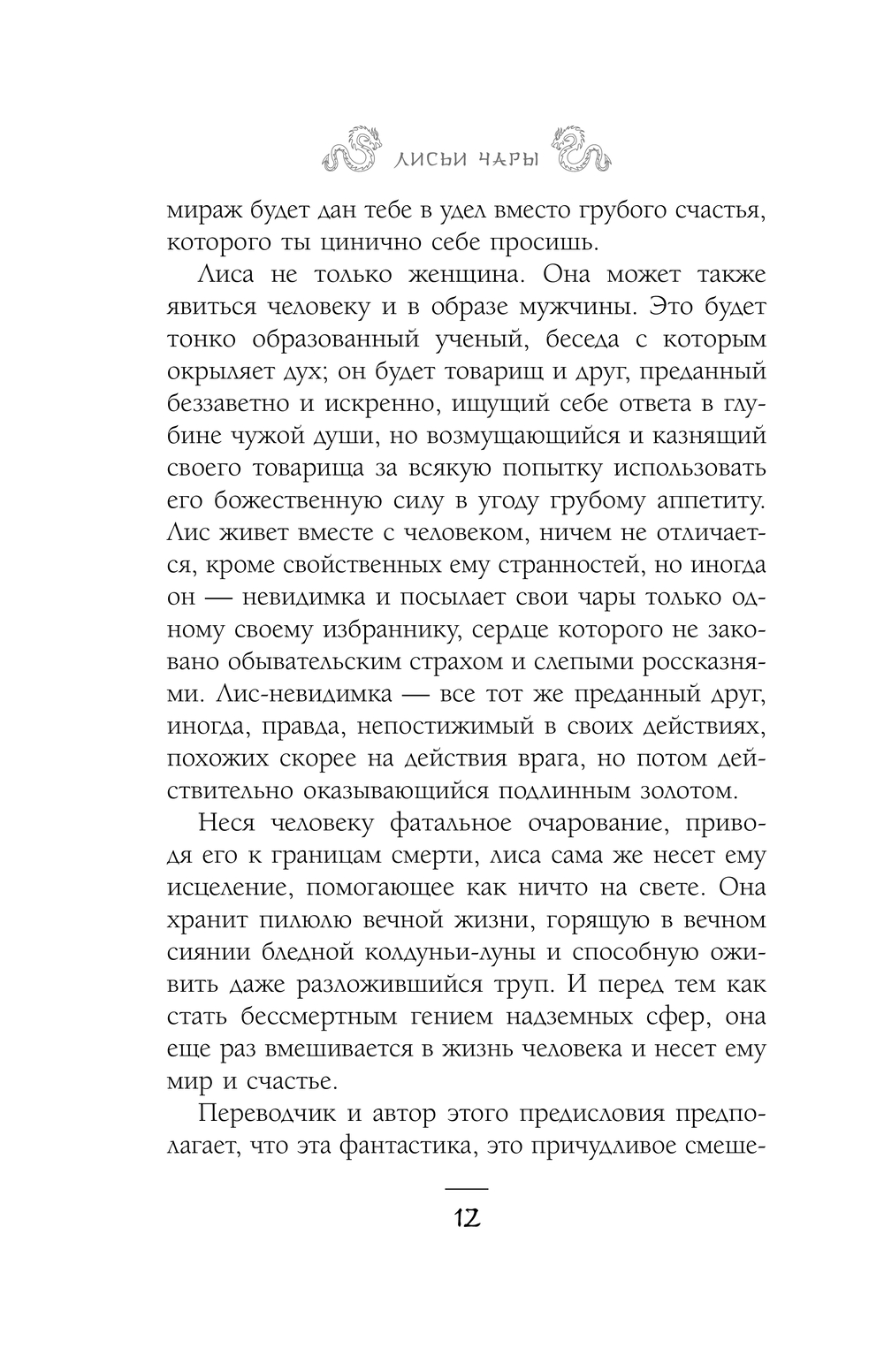 В "Лисьих чарах" собраны рассказы о призраках, лисах-оборотнях, феях, населяющих мир потустороннего, тесно связанного с реальным миром. Его обитатели взаимодействуют с обычными людьми, меняют их судьбы и участвуют в повседневной жизни.