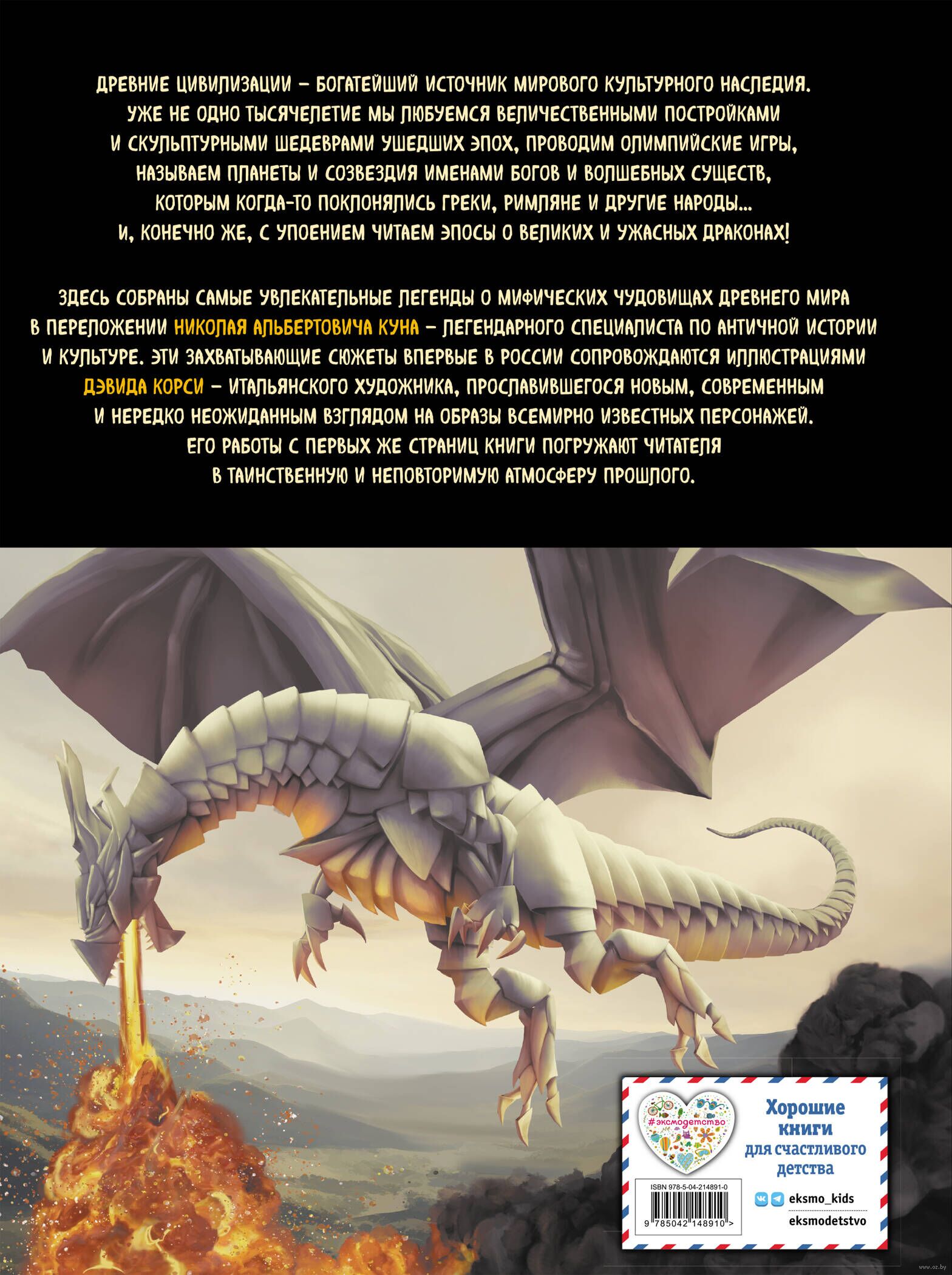 В этой красочной энциклопедии собраны истории о самых загадочных волшебных существах древнего мира в переложении Н. А. Куна: драконах, нимфах, циклопах и других мифических созданиях, в которых верили цивилизации прошлого. Захватывающие легенды сопровождаются необыкновенными атмосферными иллюстрациями современного художника Дэвида Корси. Книга станет отличным подарком для взрослых и детей по любому поводу!