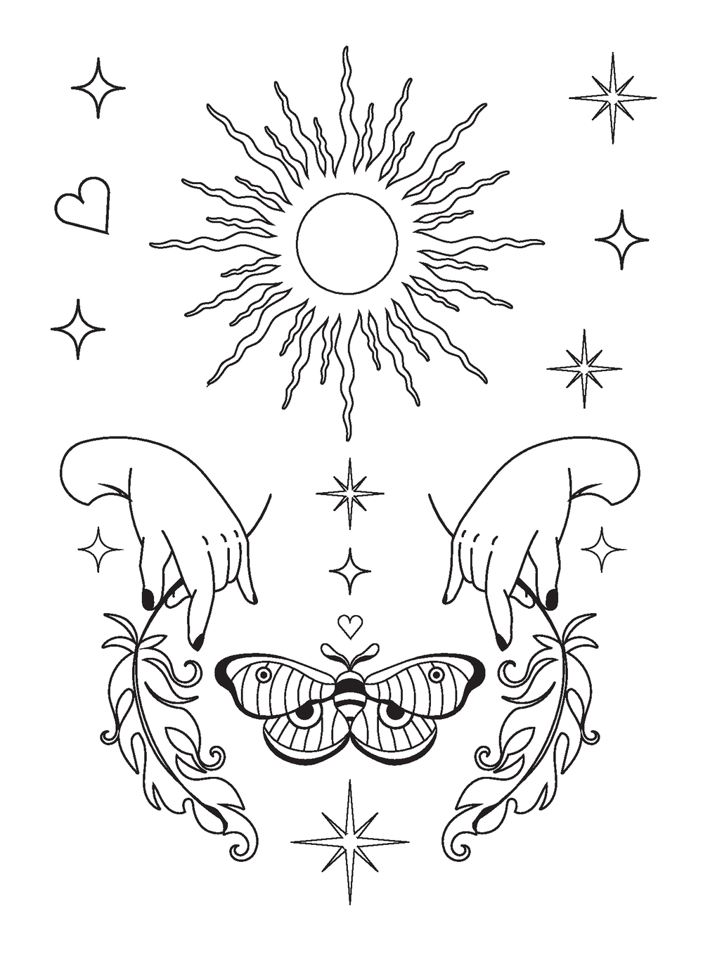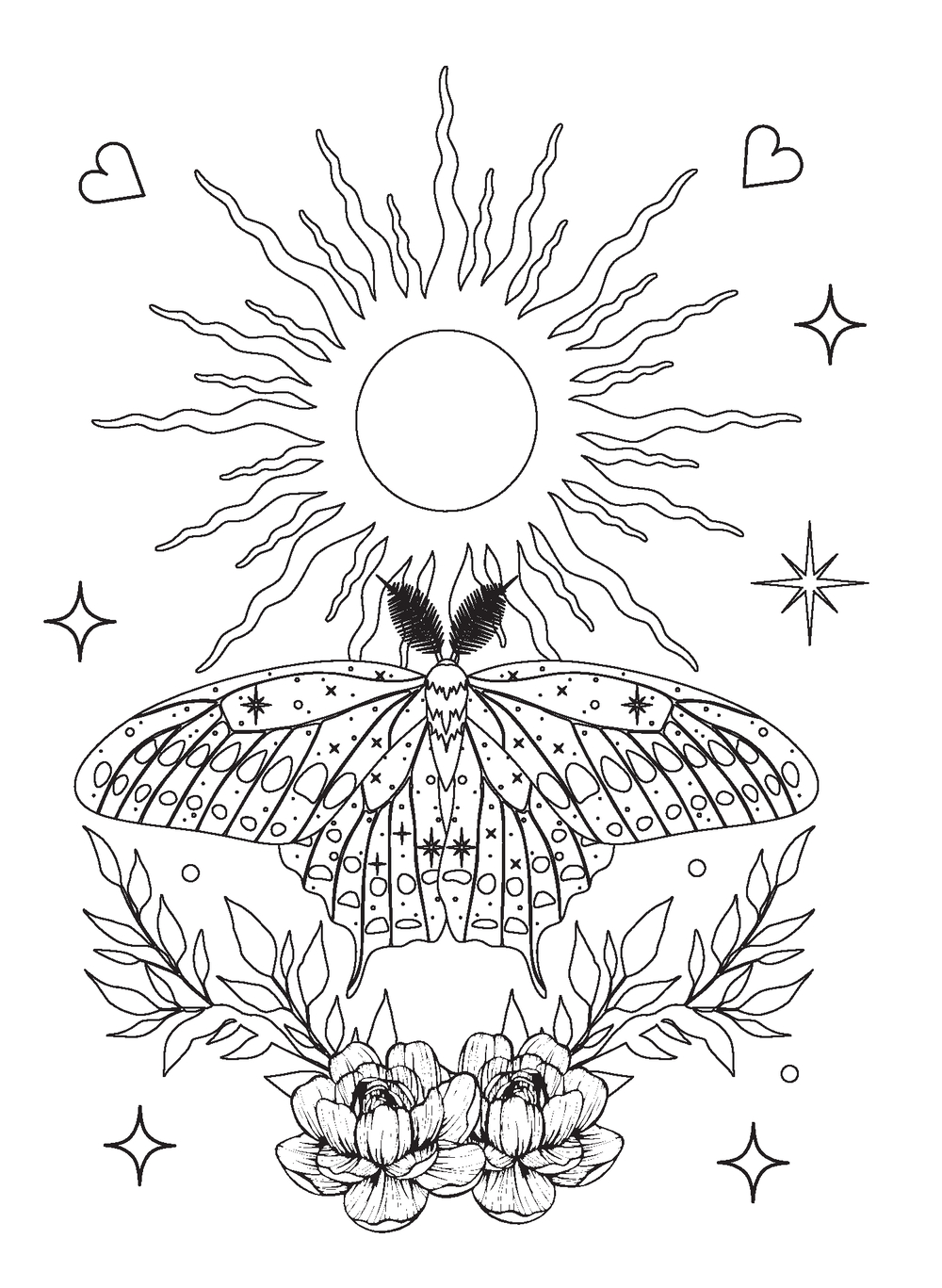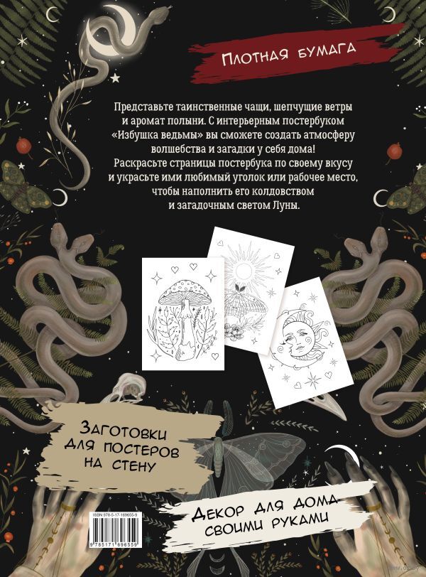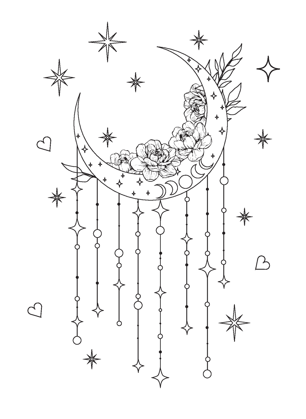 Раскрасьте страницы постербука по своему вкусу и украсьте ими любимый уголок или рабочее место, чтобы наполнить его колдовством и загадочным светом Луны.