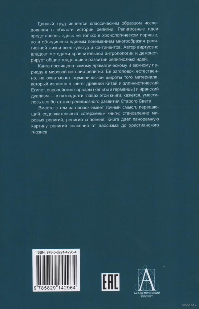 Книга посвящена самому драматическому и важному периоду в мировой истории религий. Ее заголовок, естественно, не охватывает экуменической широты того материала, который изложен в книге: древний Китай и эллинистический Египет, европейские варвары (кельты и германцы) и иранский дуализм – в пятнадцати главах этой книги, кажется, уместилось все богатство религиозного развития Старого Света.