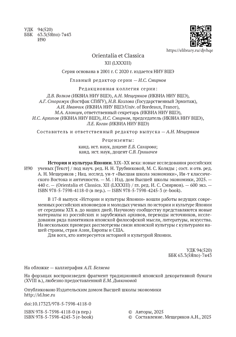 В 17-й выпуск "Истории и культуры Японии" вошли работы ведущих современных российских японоведов и молодых ученых по истории и культуре Японии от середины XIX в. до наших дней.