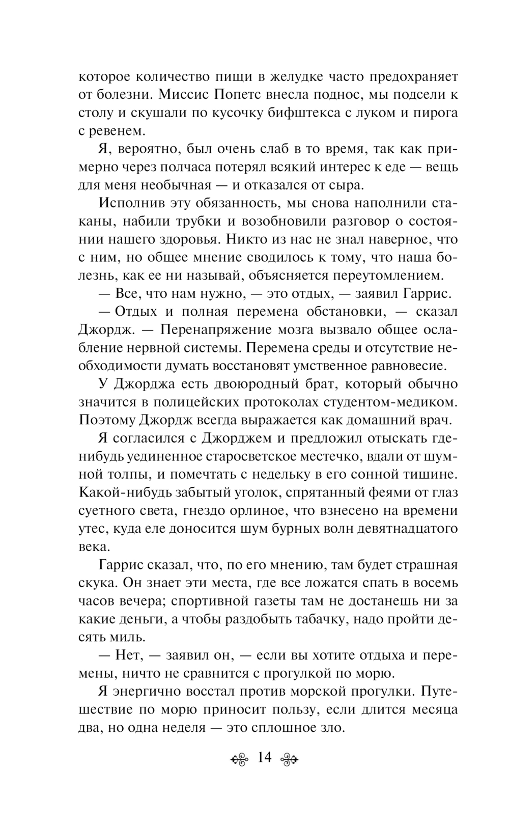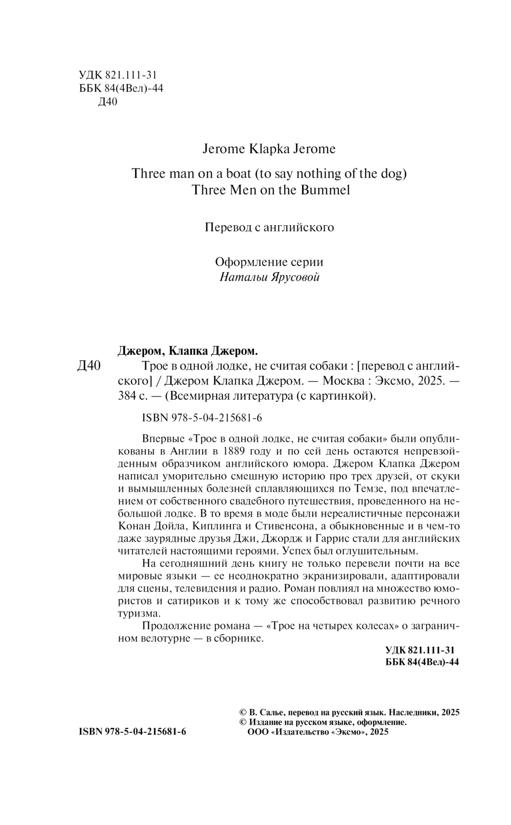 Впервые "Трое в одной лодке, не считая собаки" были опубликованы в Англии в 1889 году и по сей день остаются непревзойденным образчиком английского юмора. Джером Клапка Джером написал уморительно смешную историю про трех друзей, от скуки и вымышленных болезней сплавляющихся по Темзе, под впечатлением от собственного свадебного путешествия, проведенного на небольшой лодке. В то время "в моде" были нереалистичные персонажи Конан Дойла, Киплинга и Стивенсона, а обыкновенные и в чем-то даже заурядные друзья Джи, Джордж и Гаррис стали для английских читателей настоящими героями. Успех был оглушительным.