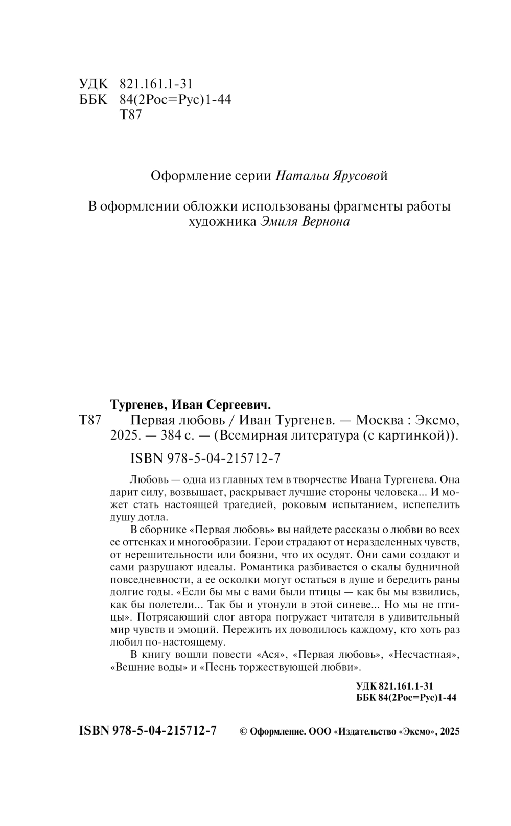 В книгу вошли повести "Ася", "Первая любовь", "Несчастная", "Вешние воды" и "Песнь торжествующей любви".