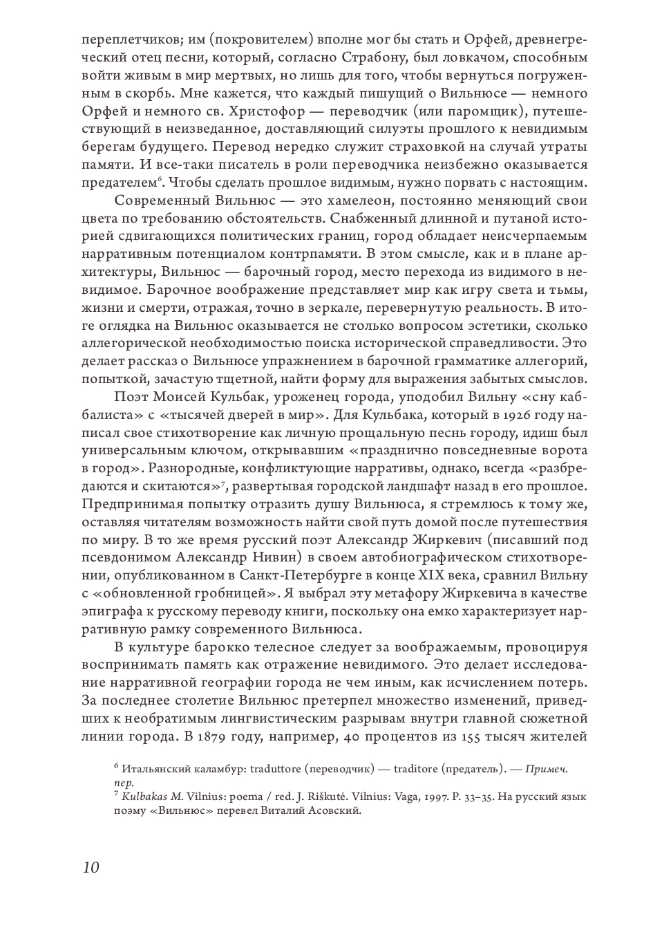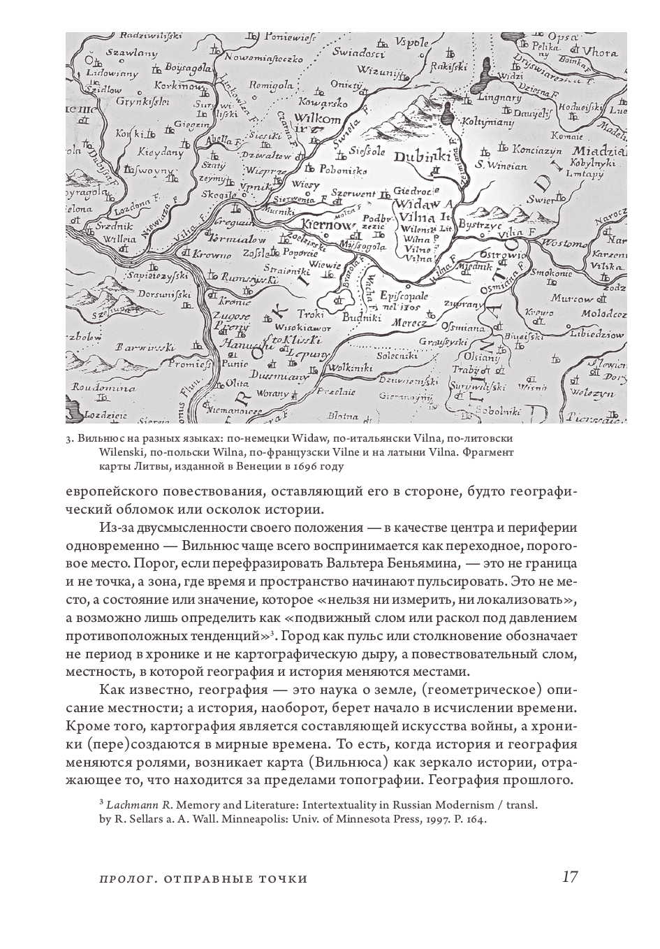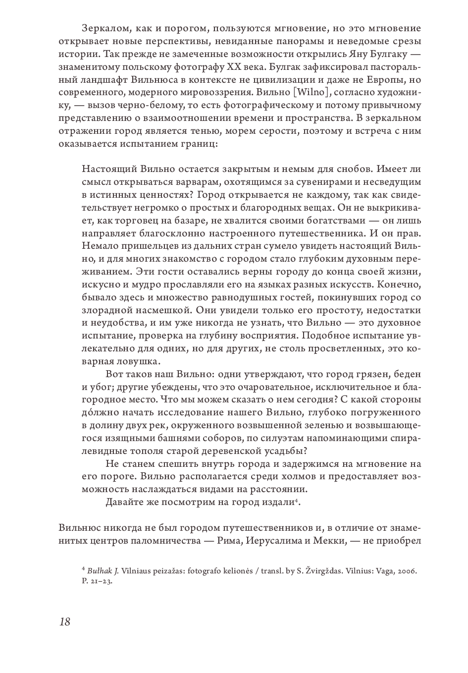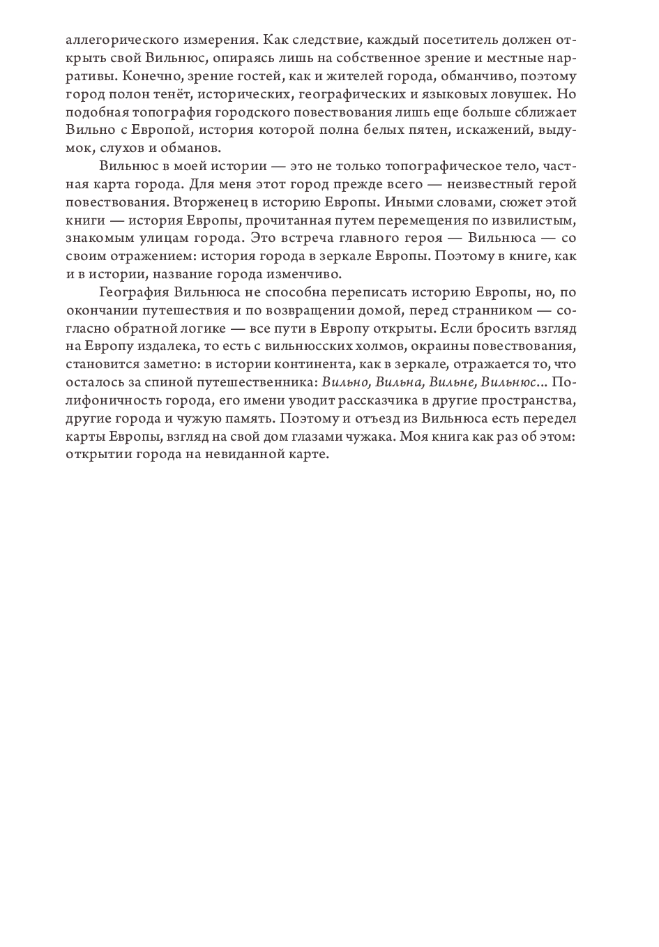 Столица языческого княжества глазами католических миссионеров; барочный город на просторах мифической Сарматии глазами европейских картографов; польская провинция глазами знаменитого путешественника и натуралиста Георга Форстера; город периода войны 1812 года глазами венского врача Йозефа Франка; Вильна в составе Российской империи глазами русских классиков (Александра Островского, Федора Достоевского, Льва Толстого); оккупированный город в годы Первой мировой войны глазами немецкого солдата-фланёра; загадочная еврейская Вильна глазами немецкого писателя-модерниста Альфреда Дёблина – вот лишь некоторые из сюжетов, вошедших в полифоническое повествование о Вильнюсе.