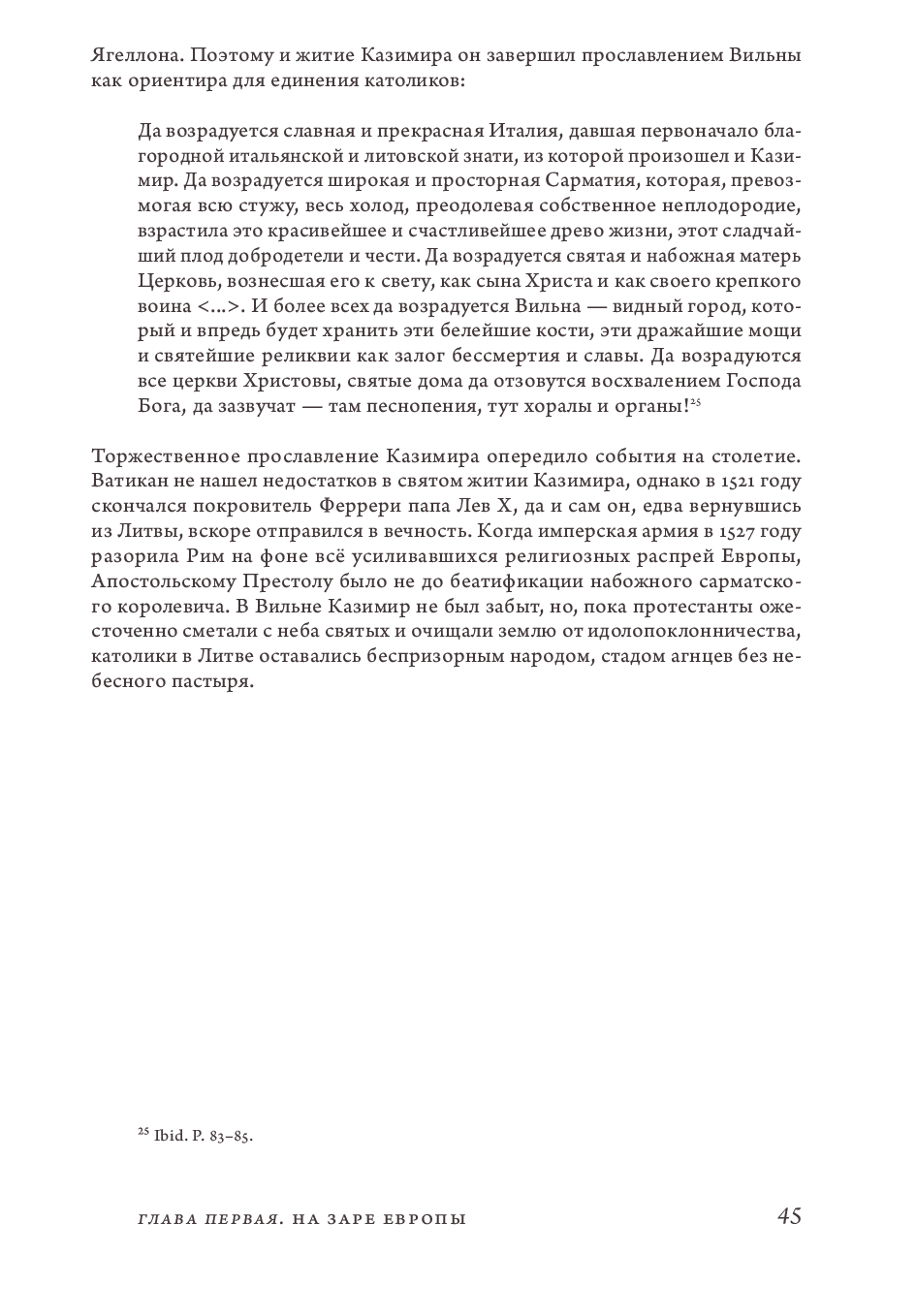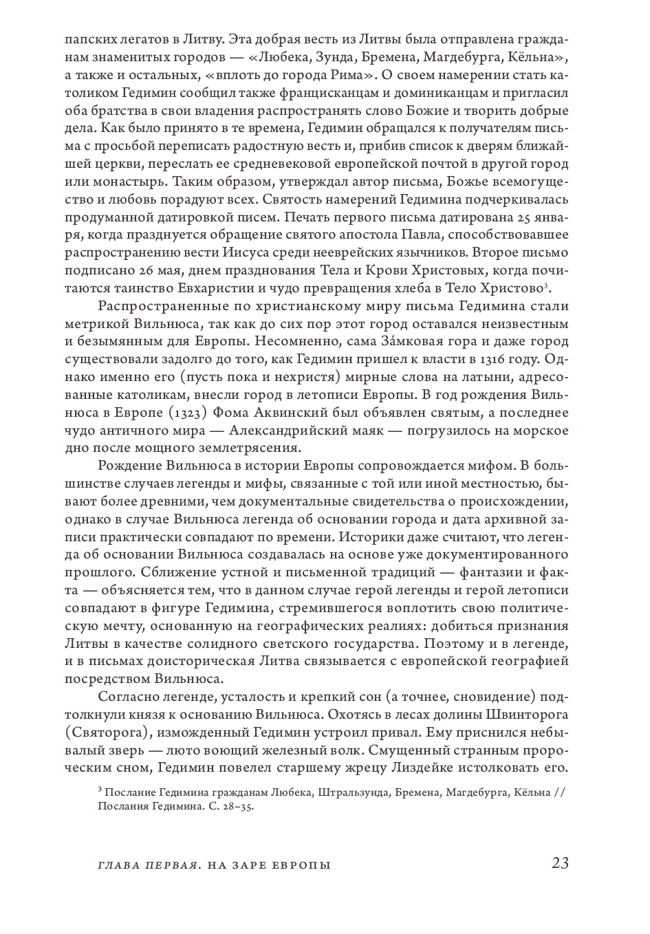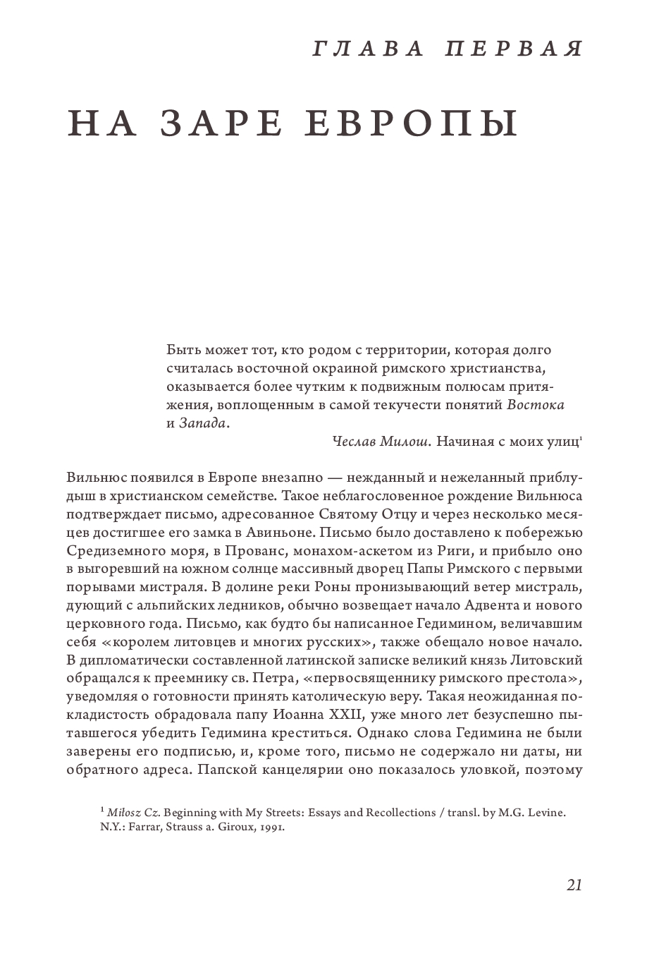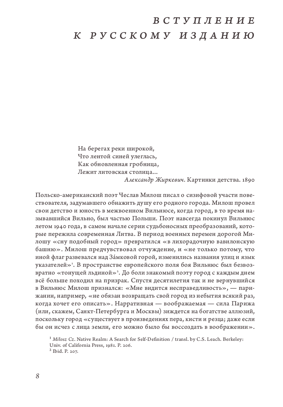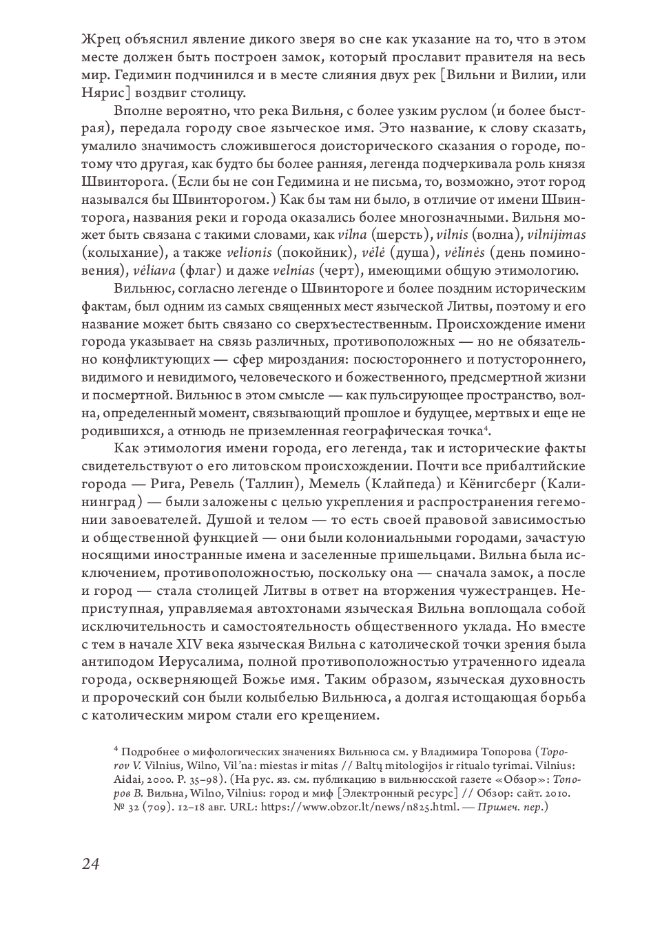 Столица языческого княжества глазами католических миссионеров; барочный город на просторах мифической Сарматии глазами европейских картографов; польская провинция глазами знаменитого путешественника и натуралиста Георга Форстера; город периода войны 1812 года глазами венского врача Йозефа Франка; Вильна в составе Российской империи глазами русских классиков (Александра Островского, Федора Достоевского, Льва Толстого); оккупированный город в годы Первой мировой войны глазами немецкого солдата-фланёра; загадочная еврейская Вильна глазами немецкого писателя-модерниста Альфреда Дёблина – вот лишь некоторые из сюжетов, вошедших в полифоническое повествование о Вильнюсе.