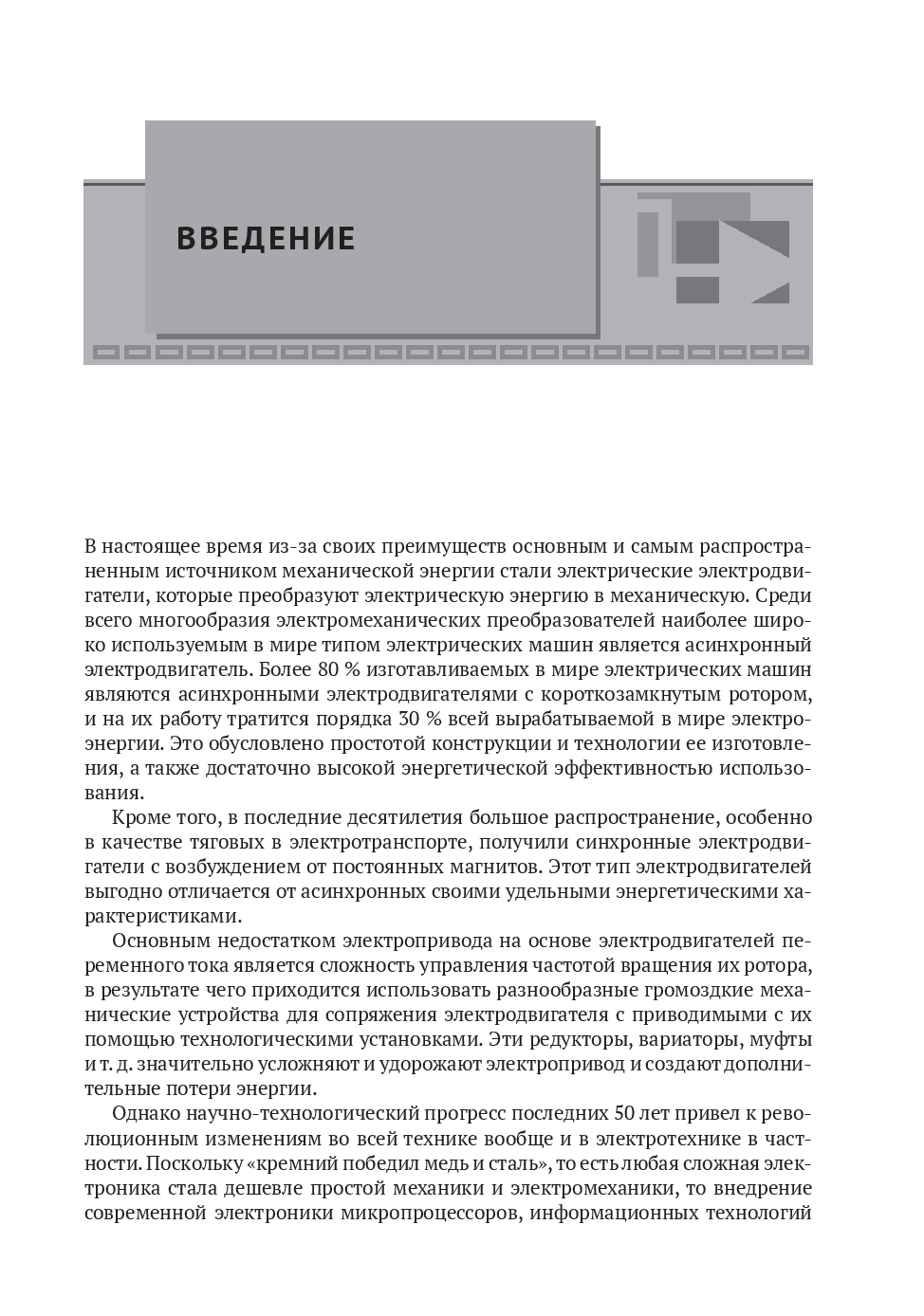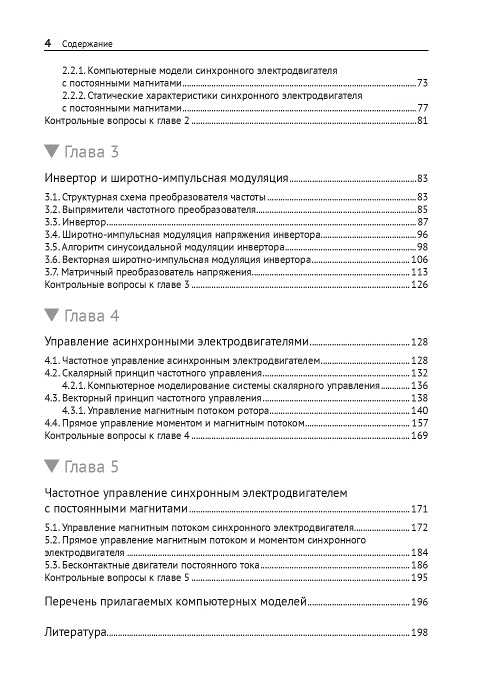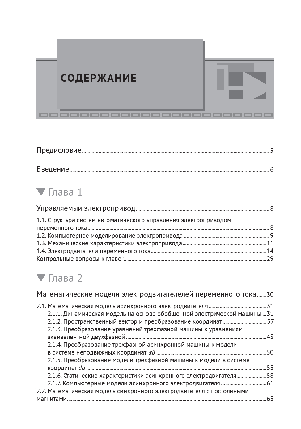 На уровне базового инженерного образования приведены общие сведения о компонентах современного управляемого электропривода: электродвигателей переменного тока, преобразователей частоты, принципах их действия и алгоритмах управления. Рассмотрены общие вопросы построения структуры автоматизированного электропривода и алгоритмы управления асинхронными электродвигателями и синхронными электродвигателями с постоянными магнитами, а также методами создания математических и компьютерных моделей их систем управления.