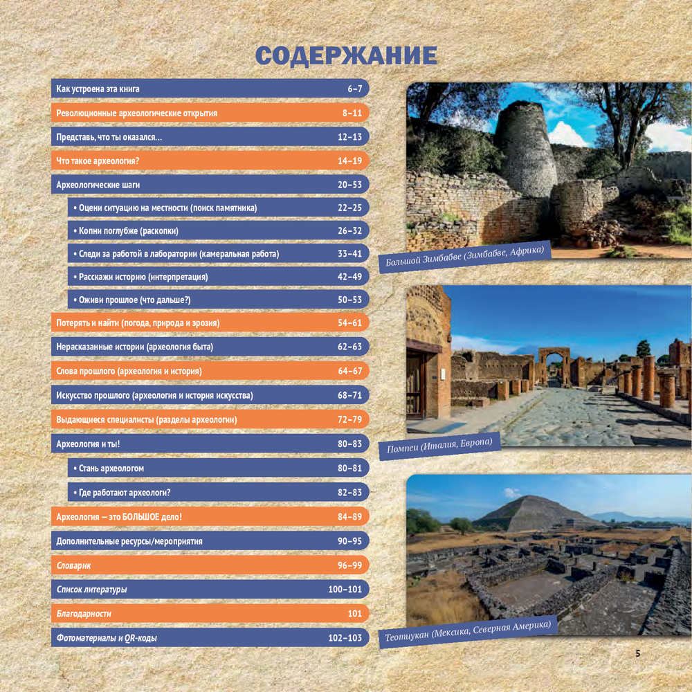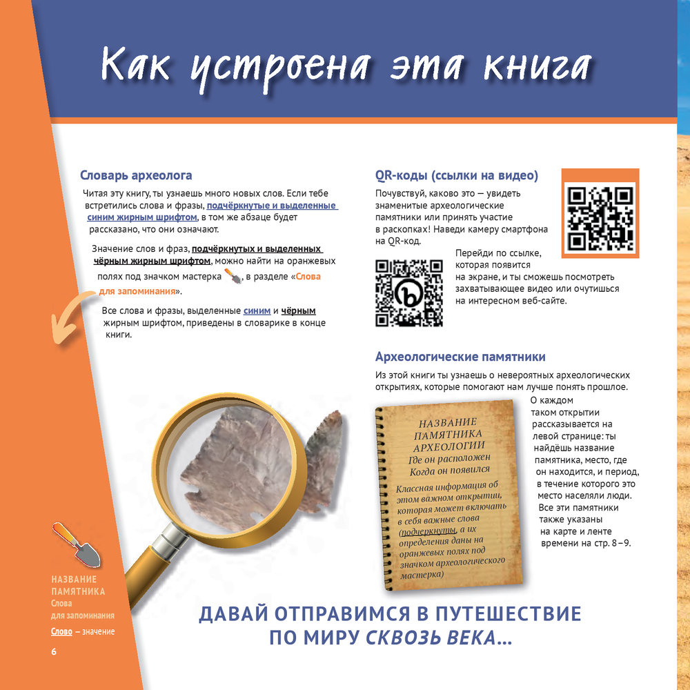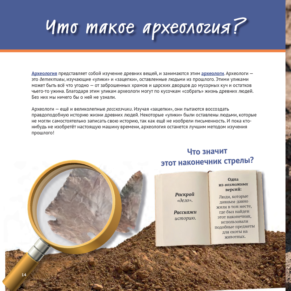 Эта книга отправляет читателей в путешествие по увлекательному миру археологии. Мы выясним, как жили представители древних цивилизаций и как учёные об этом узнали. Наш маршрут включает важные археологические шаги: поиск памятника, раскопки, лабораторную работу, интерпретацию и консервацию.