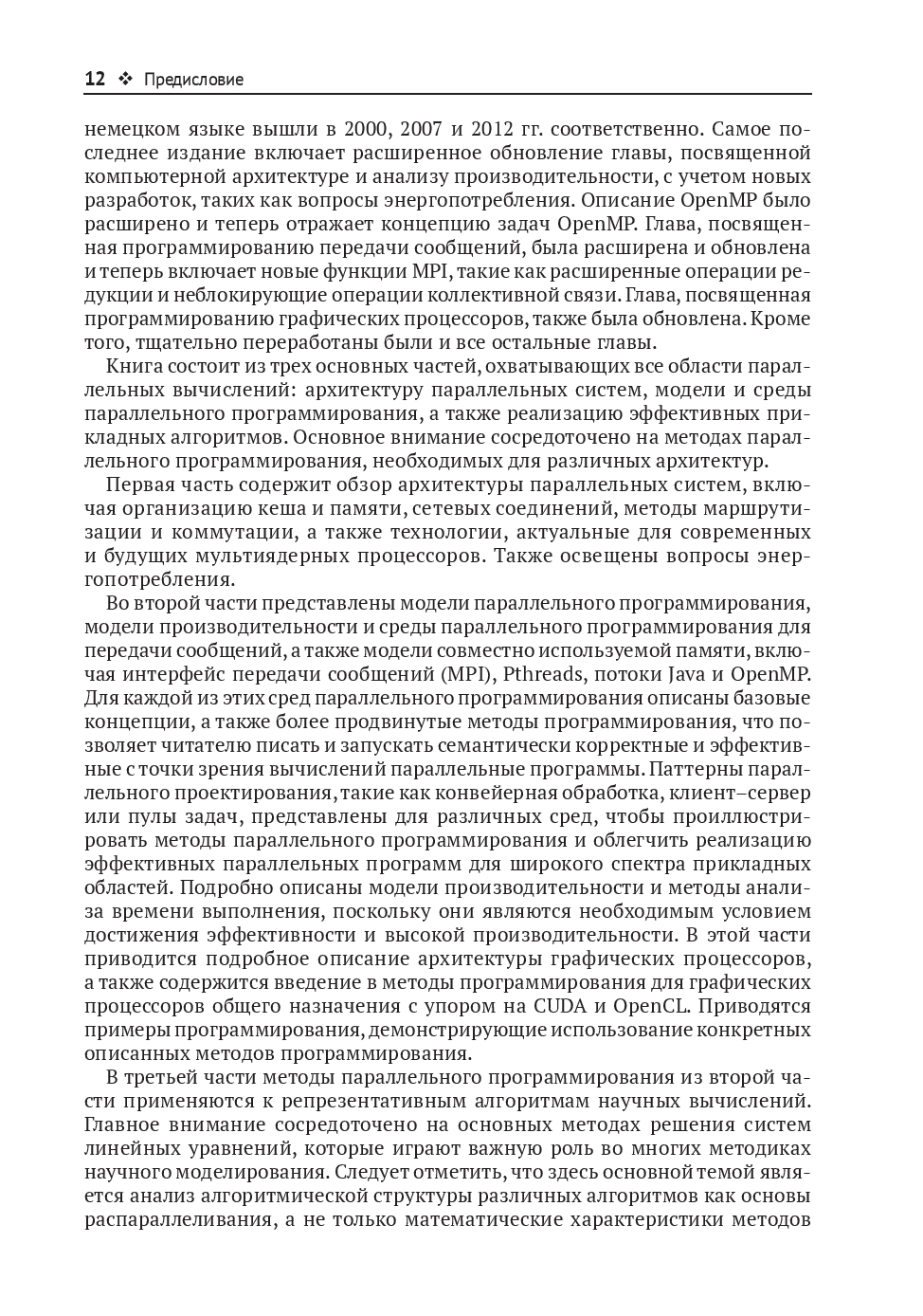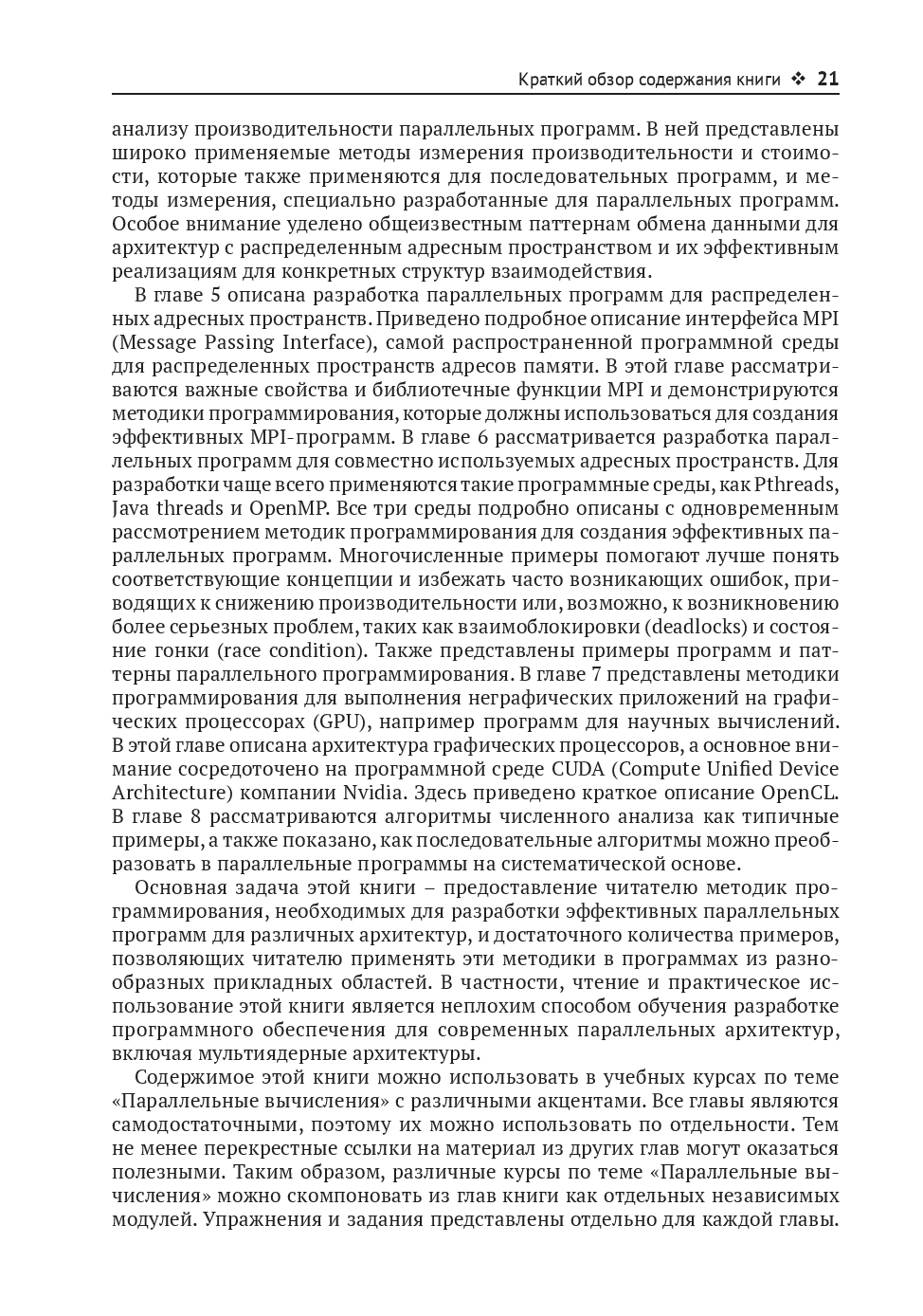 Книга охватывает все области параллельных вычислений. Для каждого алгоритма обсуждаются разные варианты распараллеливания с использованием различных методов и стратегий. В конце глав приведены упражнения для закрепления изученной темы.