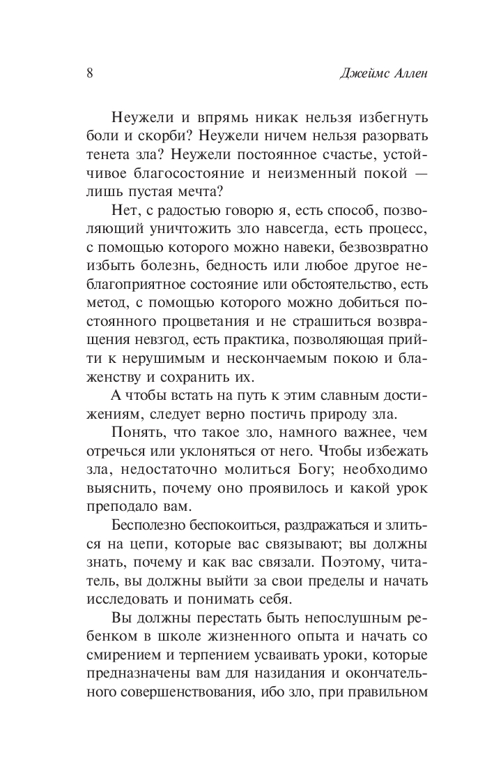 Джеймс Аллен прославился как один из первых авторов книг по саморазвитию и личностному росту, причем его уроки и советы не теряют актуальности и спустя век с момента написания. Аллен считал, что судьбу человека формирует его собственное мышление: благородные мысли ведут к процветанию, а негативные – влекут за собой провал. В своих книгах автор учил, как очистить сердце от пагубных идей, натренировать силу воли, обрести концентрацию, правильную мотивацию и четкие цели.