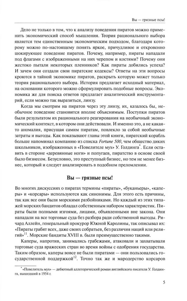 В книге Питера Т. Лисона на примере истории пиратских сообществ начала XVIII века обсуждаются проблемы экономического равновесия в условиях криминализованного сообщества. Мотивы и стимулы поведения членов таких сообществ вскрыты в книге с помощью современных методов экономического анализа и теории рационального выбора.