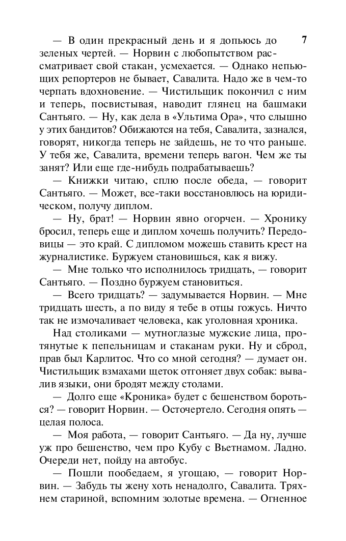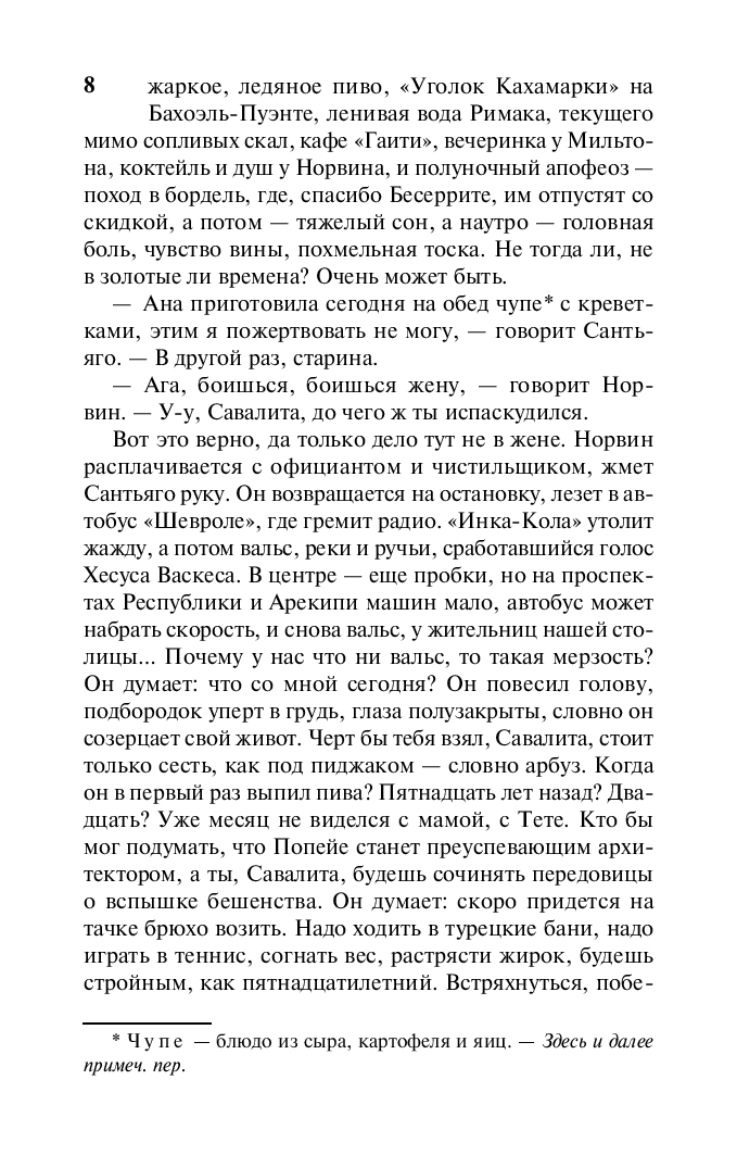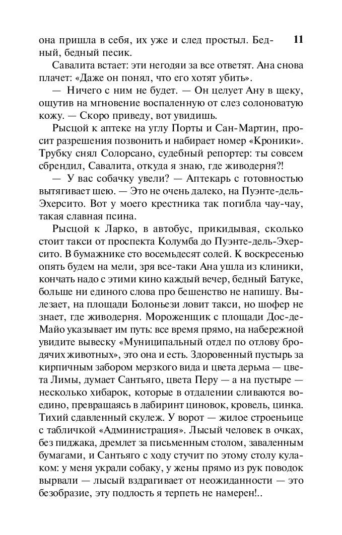 В дешевом питейном заведении встречаются двое: Сантьяго Савала, сын богатого перуанского буржуа Фермина Савалы, и негр Амбросио, когда-то работавший у них шофером. Бывший господин и слуга; когда-то их разделяла пропасть, а сегодня они сошлись в убогой забегаловке с претенциозным названием "Собор". Стоит ли удивляться? Ведь они живут в стране равных возможностей, где каждый имеет шанс – шанс скатиться на обочину жизни. По собственной воле или по воле злодейки-судьбы…