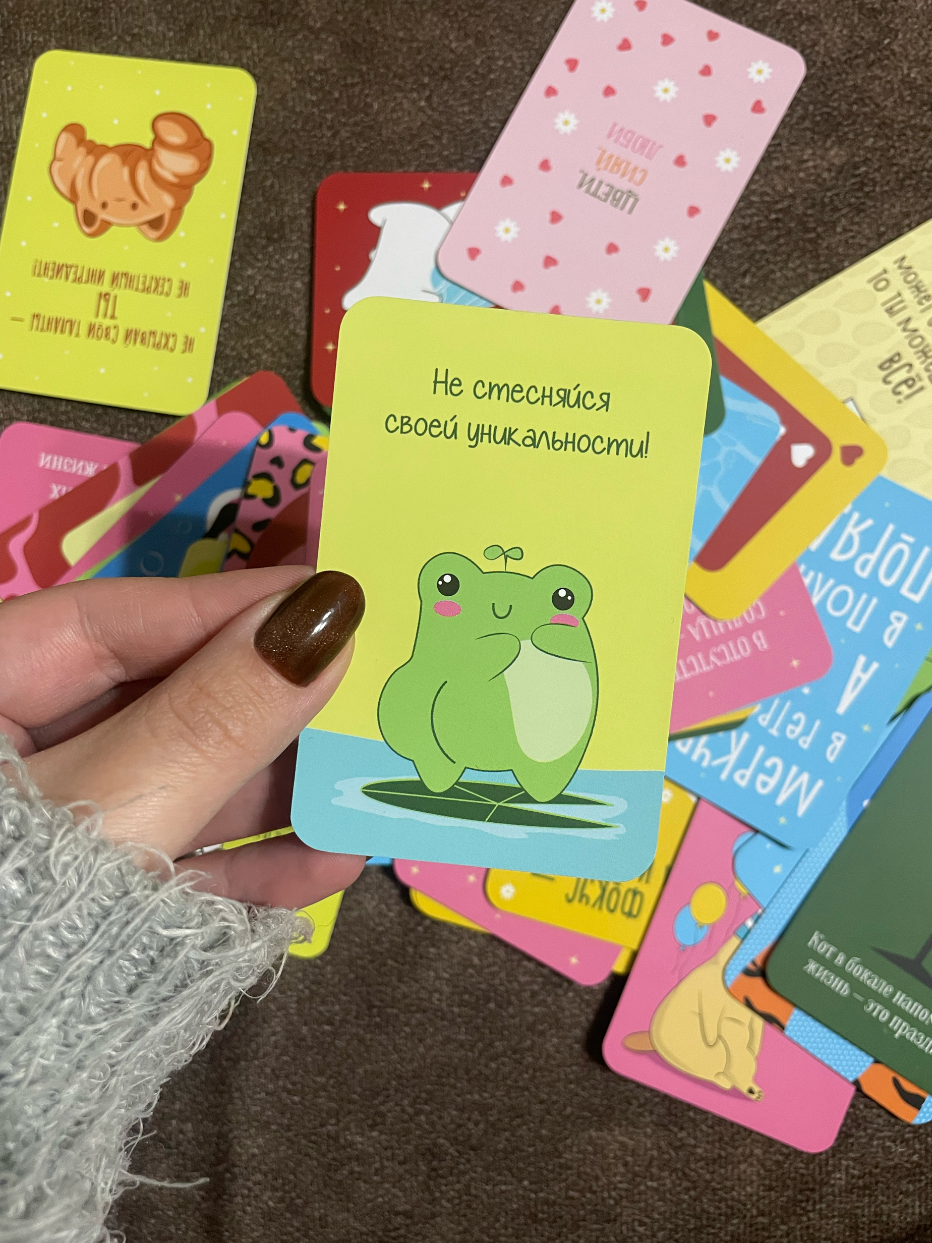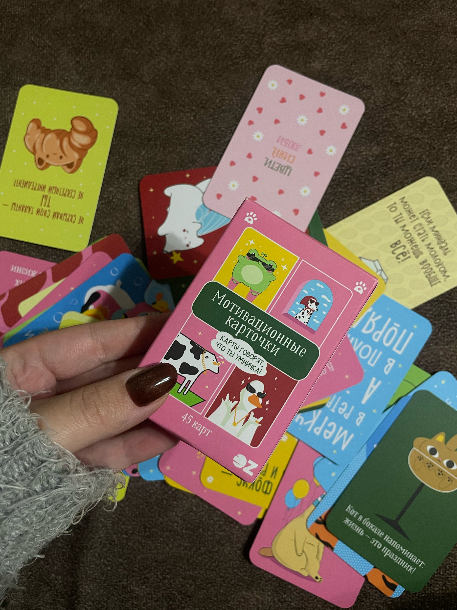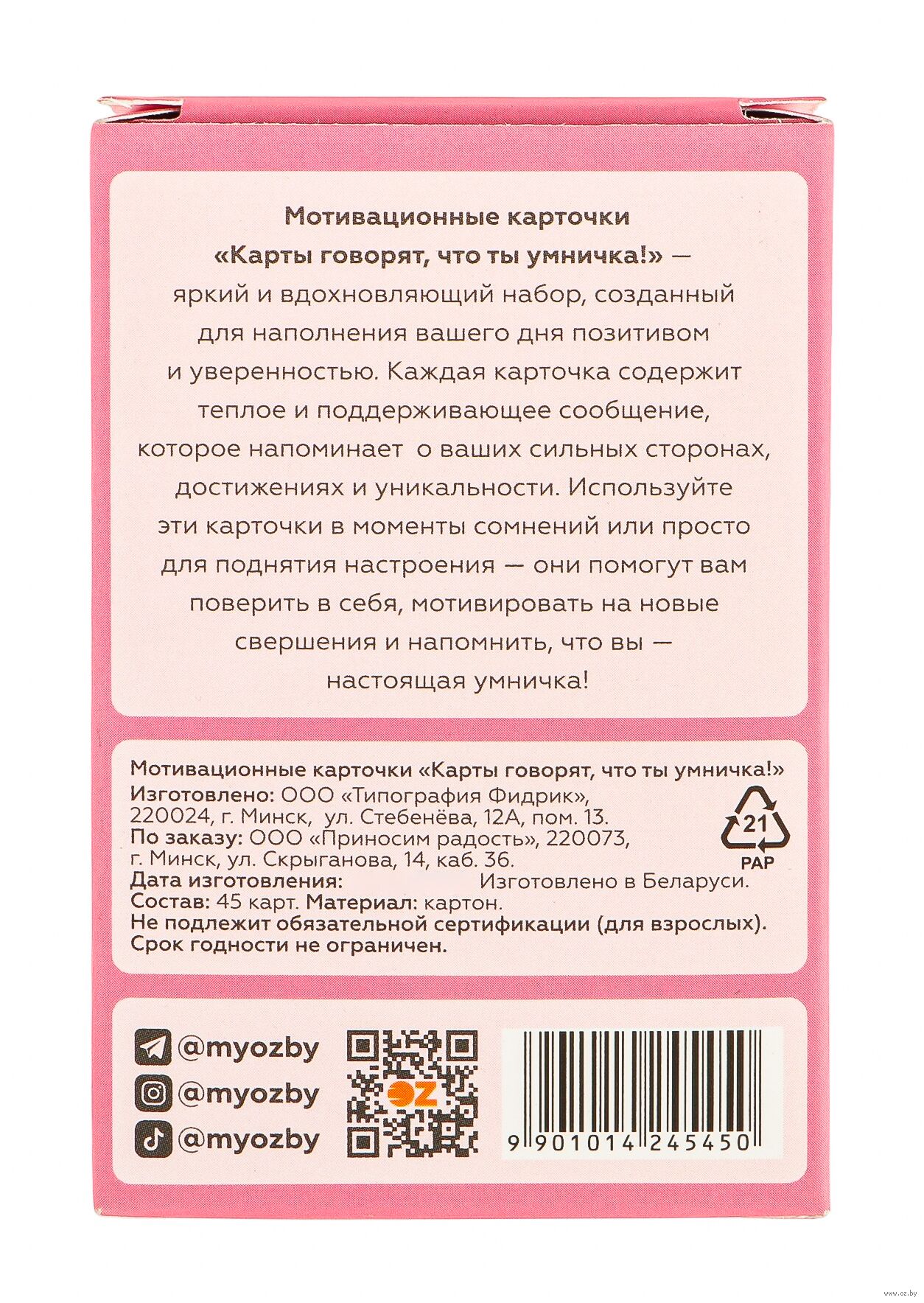 Мотивационные карточки "Карты говорят, что ты умничка!" – яркий и вдохновляющий набор, созданный для наполнения вашего дня позитивом и уверенностью. Каждая карточка содержит теплое и поддерживающее сообщение, которое напоминает о ваших сильных сторонах, достижениях и уникальности. Используйте эти карточки в моменты сомнений или просто для поднятия настроения – они помогут вам поверить в себя, мотивировать на новые свершения и напомнить, что вы – настоящая умничка!