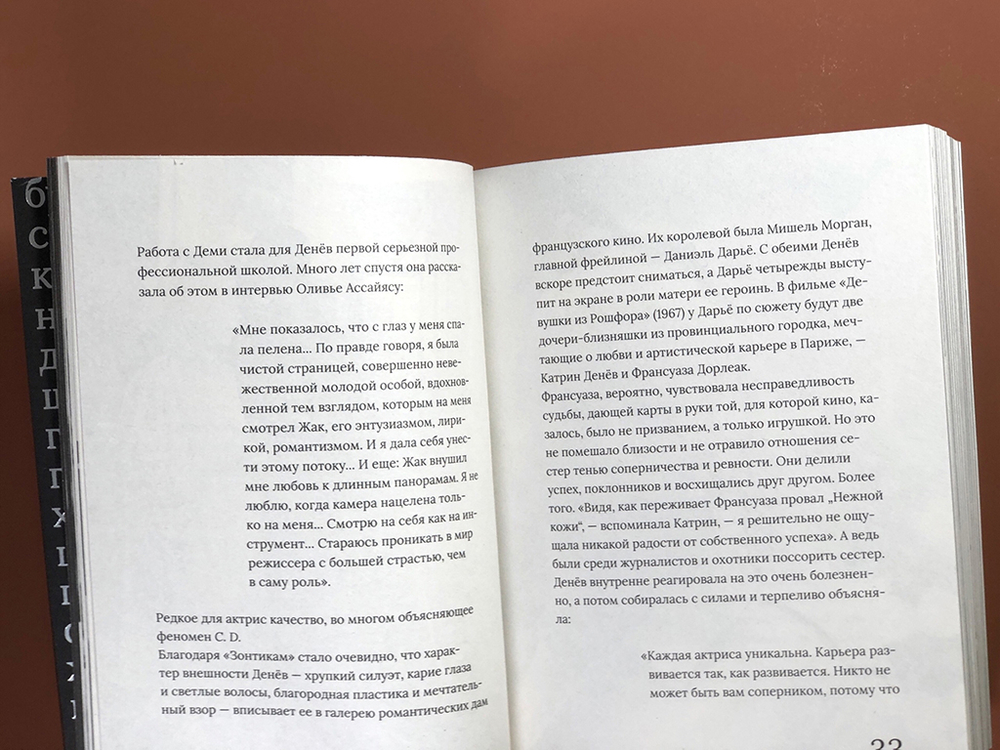 Автор рассказывает о ключевых ролях французской актрисы: от "Шербурских зонтиков" Деми и "Дневной красавицы" Бунюэля до "8 женщин" Озона и "Правды" Корээды. Издание дополняет избранная фильмография и избранная библиография.