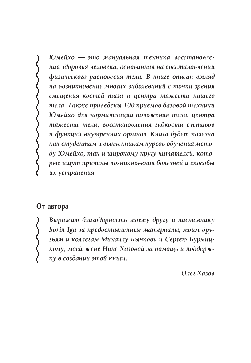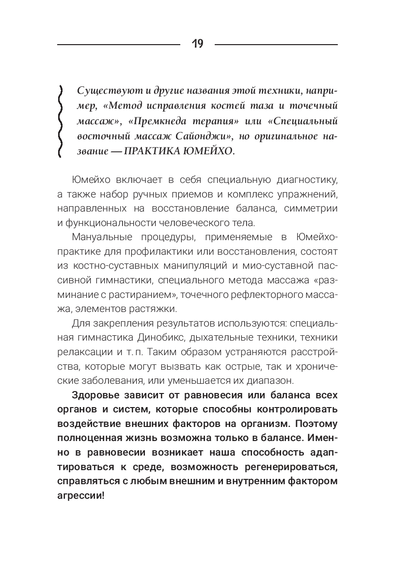 Книга подойдет для изучающих и практикующих Юмейхо, а также для массажистов, мануальных терапевтов, остеопатов и тех, кто интересуется темой сохранения и восстановления здоровья.