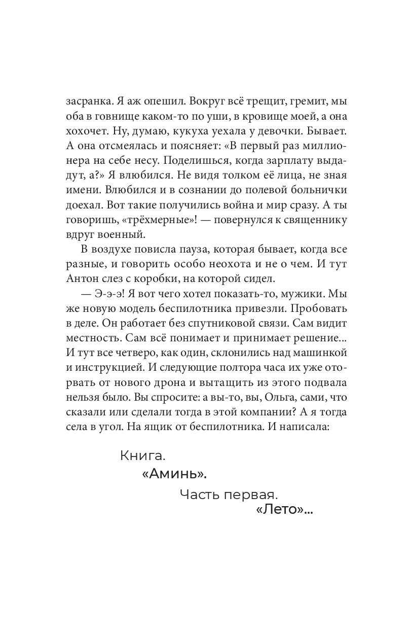 "Аминь" – это уже четвертый роман Ольги Усковой, основательницы и президента группы компаний Cognitive Technologies, разработчиков роботов и технологий искусственного интеллекта.