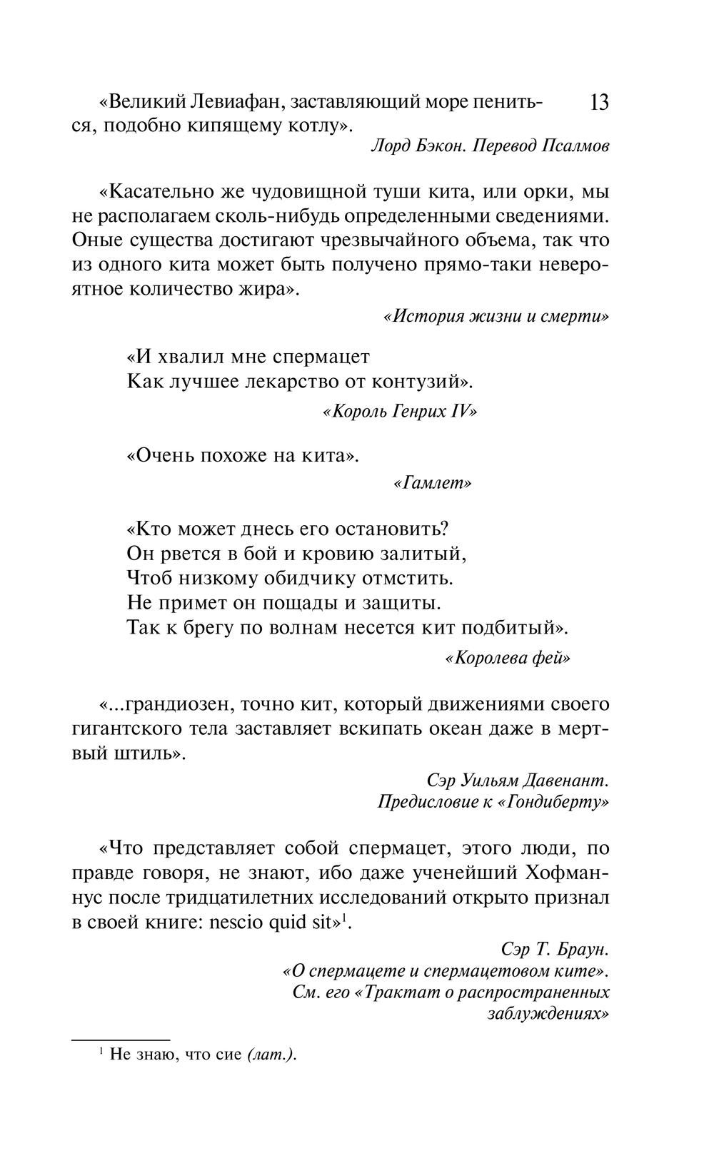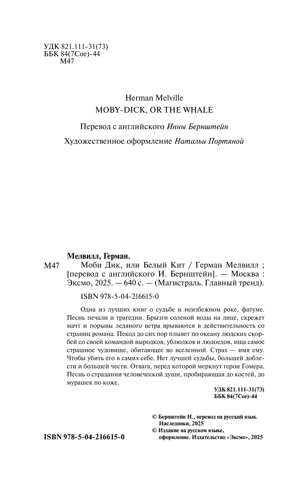 Одна из лучших книг о судьбе и неизбежном роке, фатуме. Песнь печали и трагедии. Брызги соленой воды на лице, скрежет мачт и порывы ледяного ветра врываются в действительность со страниц романа. Пекод до сих пор плывёт по океану людских скорбей со своей командой выродков, ублюдков и людоедов, ища самое страшное чудовище, обитающее во вселенной. Страх – имя ему. Чтобы убить его в самих себе. Нет лучшей судьбы, большей доблести и большей чести. Отвага, перед которой меркнут герои Гомера. Песнь о страдании человеческой души, пробирающая до костей, до мурашек по коже.