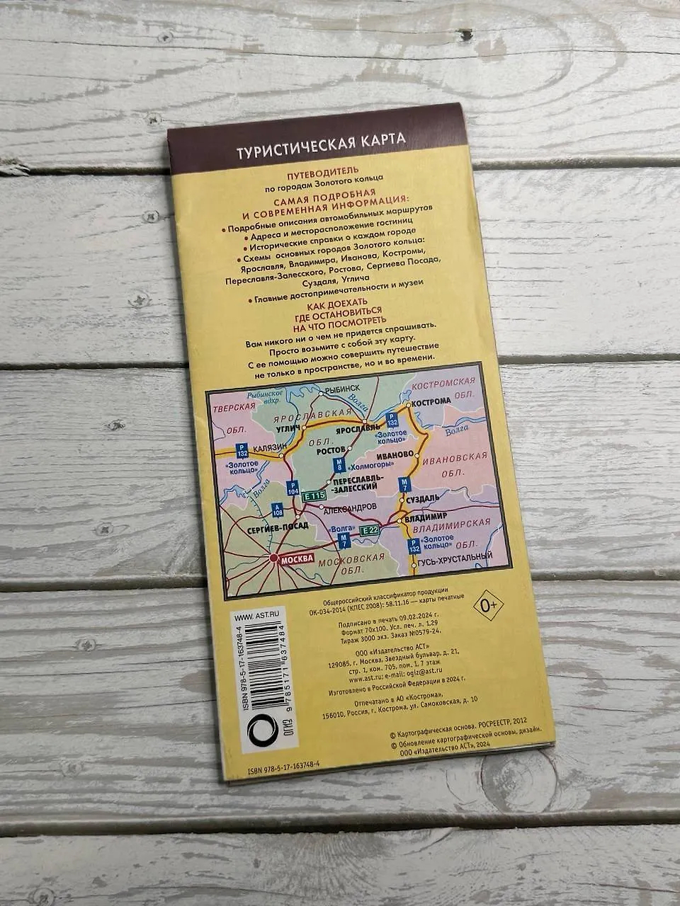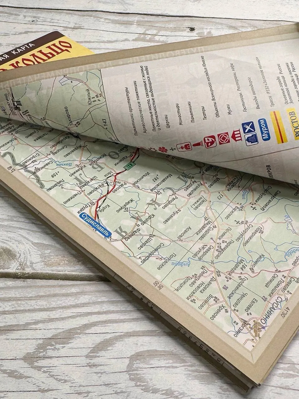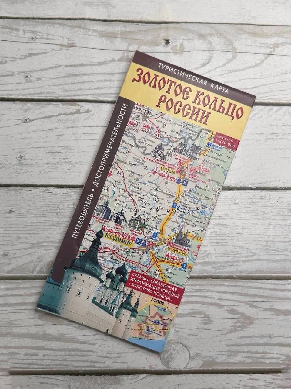 Складная туристическая карта "Золотое кольцо России" посвящена уникальному региону нашей страны, расположенному в междуречье Волги и Оки, где сосредоточены древние русские города, без которых немыслима история России. Масштаб карты 1:370 000 (в 1 см 3,7 км) и специально разработанная система условных обозначений позволили во всем многообразии представить имеющиеся в городах Золотого кольца исторические, архитектурные, религиозные и культурные памятники, многие из которых входят в список объектов Всемирного наследия ЮНЕСКО. На карте также подробно показана сеть автомобильных и железных дорог, обеспечивающих доступ к каждому из городов. Оборот карты представляет собой путеводитель по городам Золотого кольца, содержание которого составляют описания автомобильных маршрутов, исторические справки о каждом городе, адреса и месторасположение гостиниц, схемы городов Золотого кольца, их главные достопримечательности и музеи.
