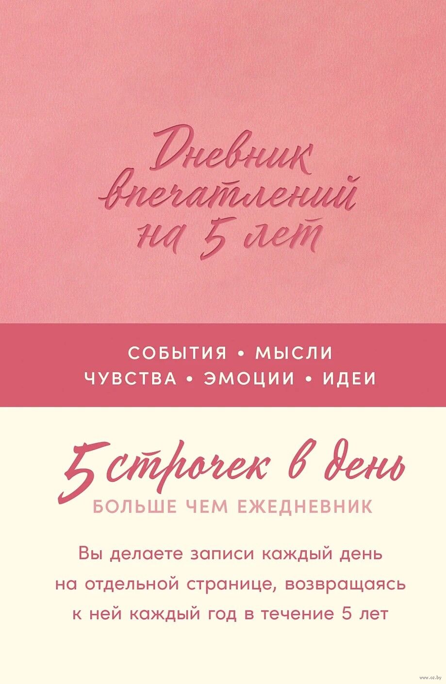 "Дневник впечатлений на 5 лет" создан для того, чтобы вы могли записывать что-то особенное о каждом дне. Хотите ли вы зафиксировать свои достижения, мысли, идеи или красоту момента, оставить на будущее важные размышления, заметить перемены и задуматься о главном – дневник идеально для этого подойдет.