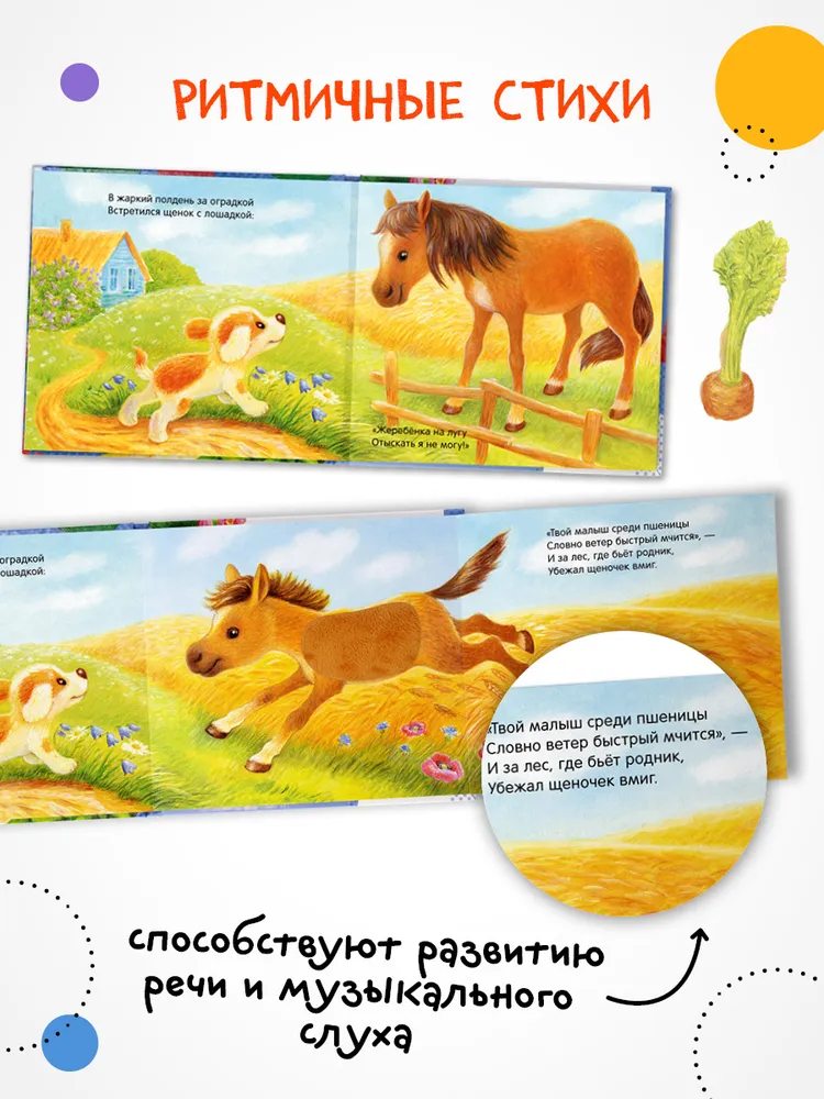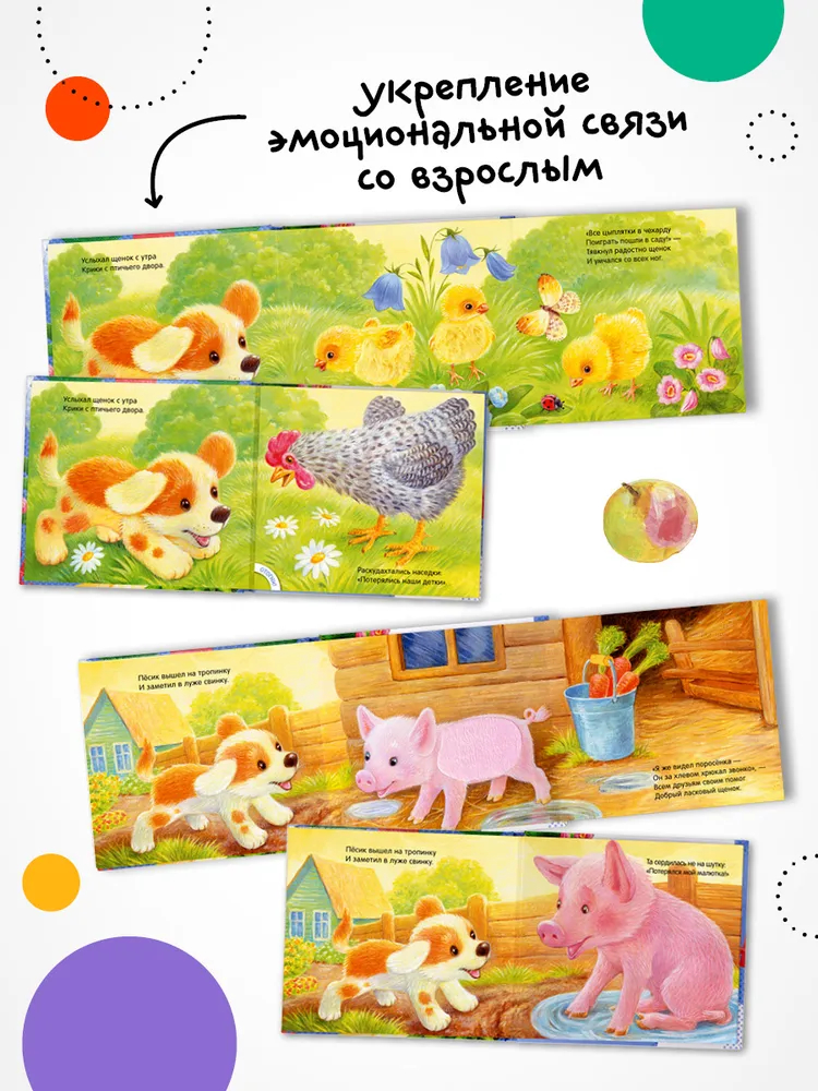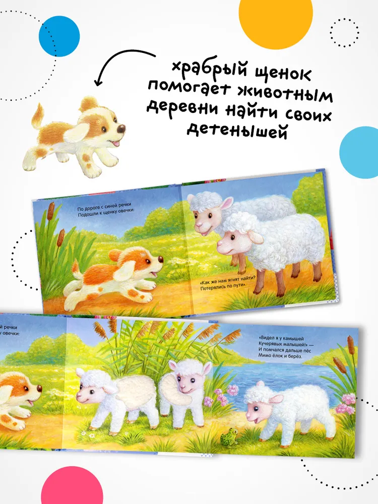 Книжка-игрушка "Щенок" из серии "Потрогай и погладь" с раскладывающимися панорамными страницами расскажет малышам о том, как все животные в деревне потеряли своих детенышей, а храбрый щенок помог мамам найти своих ягнят, жеребят, котят.