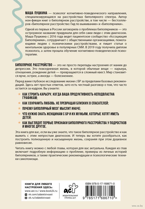Каждая из глав включает подробную информацию о проблеме, примеры из личных историй биполярников, а также практические рекомендации и психологические техники самопомощи.