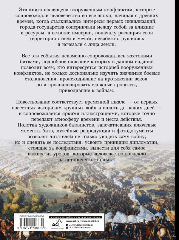В книге представлено подробное описание самых важных сражений от древности до наших дней, с акцентом на их визуальном отображении. Исчерпывающая информация о ключевых военных событиях представлена здесь в сопровождении тщательно подобранного иллюстративного материала. Он включает полотна художников-баталистов, запечатлевших ключевые моменты битв, а также музейные репродукции и фотодокументы, которые помогут перенестись в те времена и прочувствовать атмосферу грандиозных событий, словно создавая эффект присутствия.