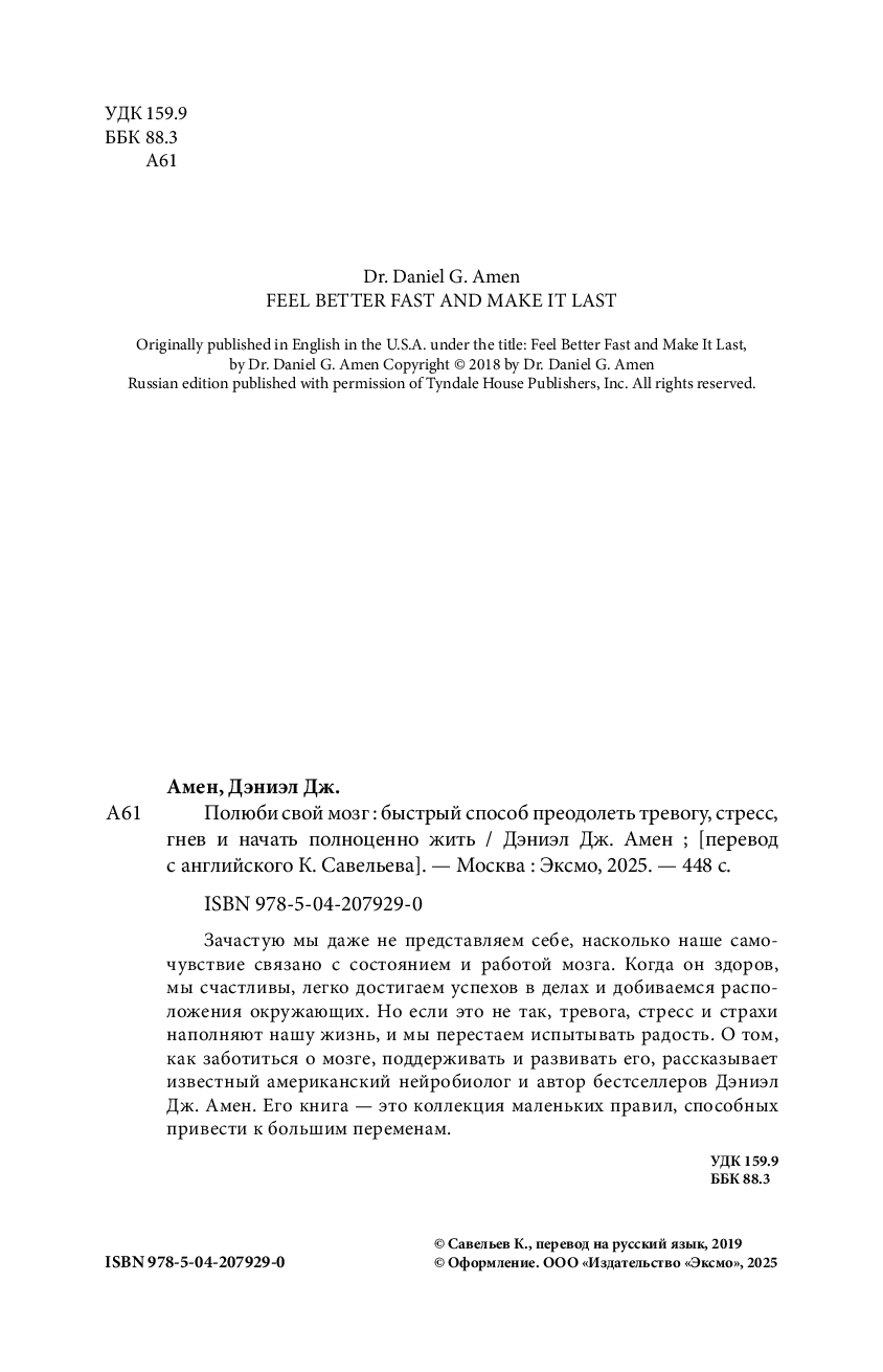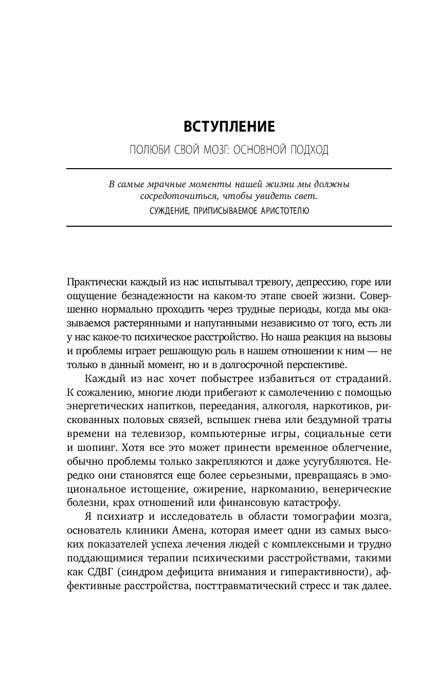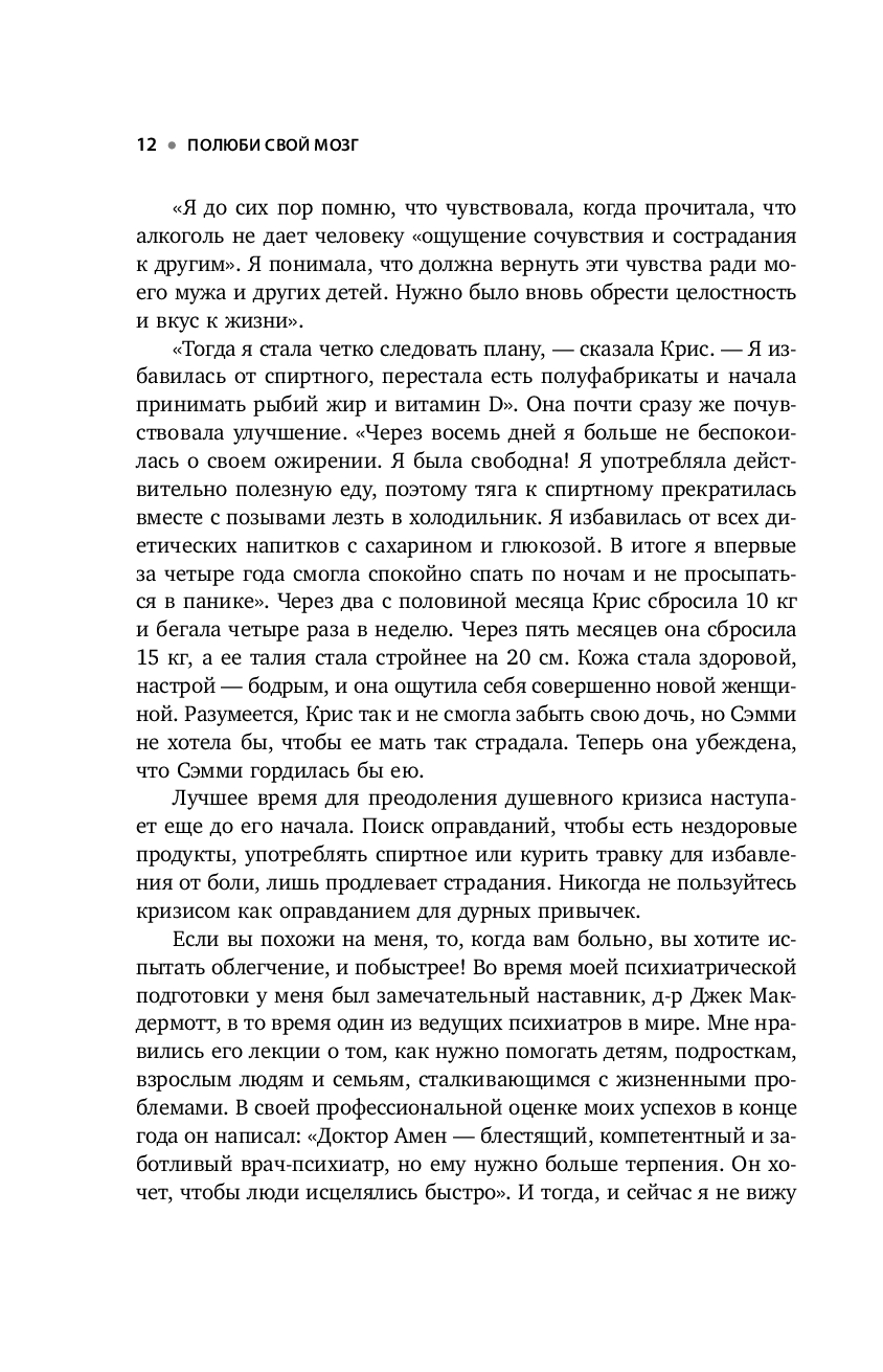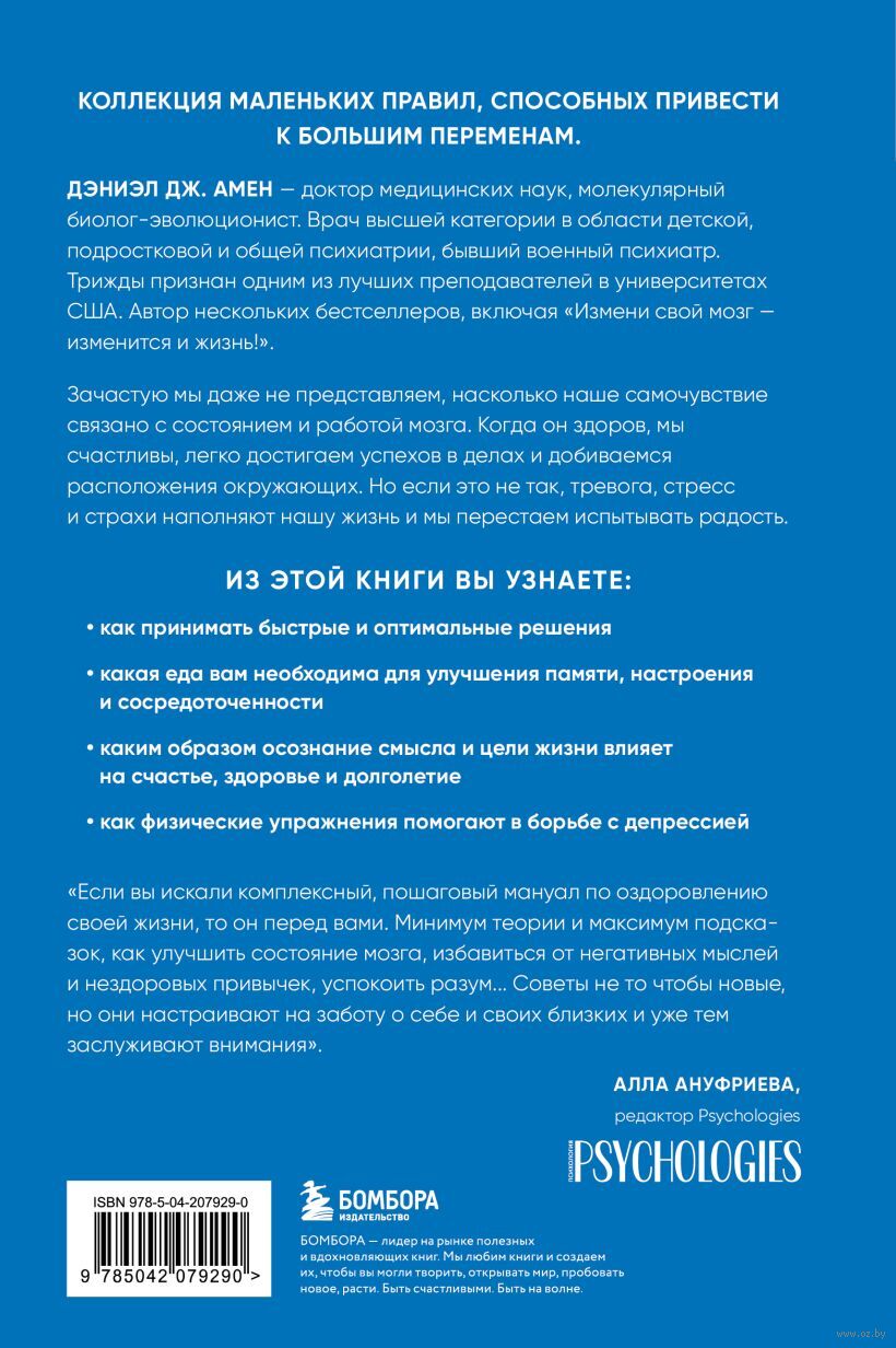 В счастливом человеке – здоровый мозг! И для известного американского нейробиолога и автора бестселлеров Дэниэла Дж. Амена это давно подтвержденный факт. Его клинический опыт и исследования показывают: наше физиологическое состояние напрямую влияет на эмоции, чувства, мысли и отношения, область психологическую, социальную и духовную. Почувствовать улучшение в каждой из этих сфер можно, если беречь свой мозг и развивать его. О методах, способных помочь решению этих задач, автор увлекательно рассказывает на страницах своей книги.