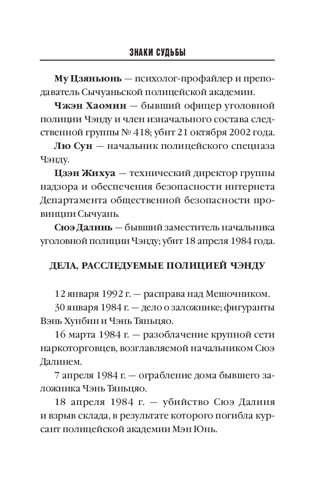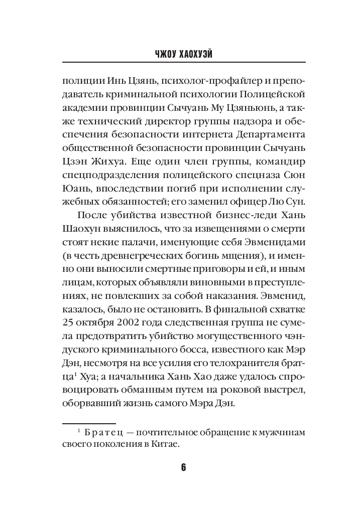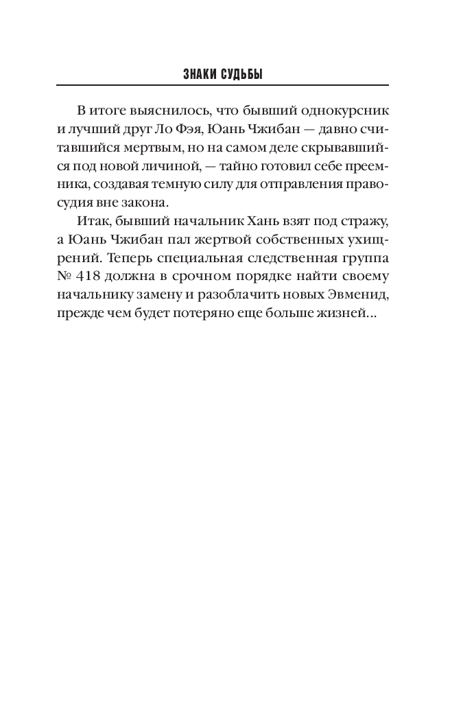 Единственная подсказка, оставленная преступником, – уведомление о смерти. Подпись прежняя: "Эвмениды". Офицер полиции Ло Фэй, новый начальник оперативной группы, с ужасом понимает: убийца-палач успел подготовить преемника...